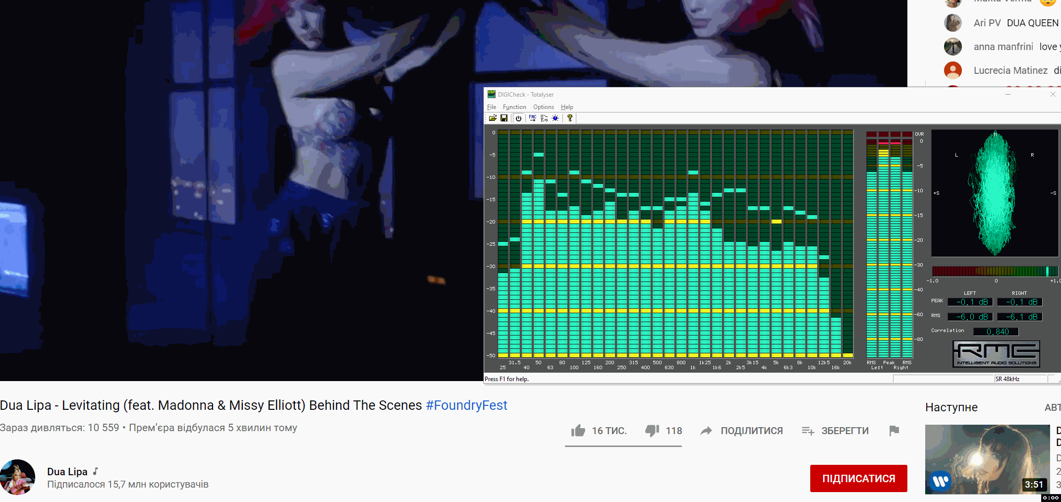 И что? Причём тут кратковременны, и тем более рмс? Речь о интегрейтет тайм, он замеряется за ВЕСЬ трек. В случае с прямым эфиром, он калибруется short-term и пиком 0dbfs ppm.Сегодня на ютюбе попал на презентацию видео от Dua Lipa. По принципу прямой трансляции в назначенное время, живой чат, обратный отсчет и т.д. Какого-то "прямого включения" не было. Просто был запланированный показ клипа. Который заранее был залит и обработан в ютюбе. И вот в таком виде ютюб не делал никаких -14LUFS, хотя мог. RMS измеритель показывал от -5 до кратковременных -2 RMS.
