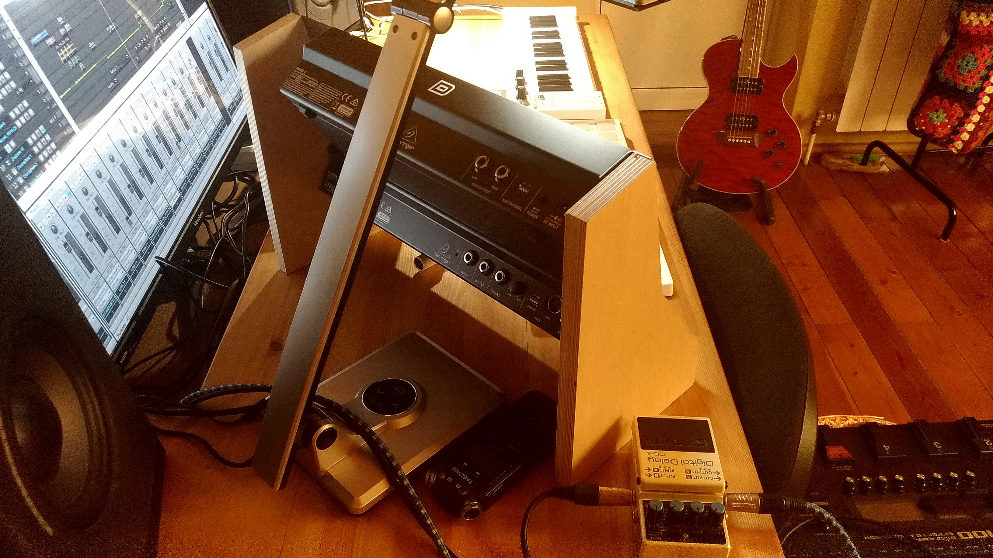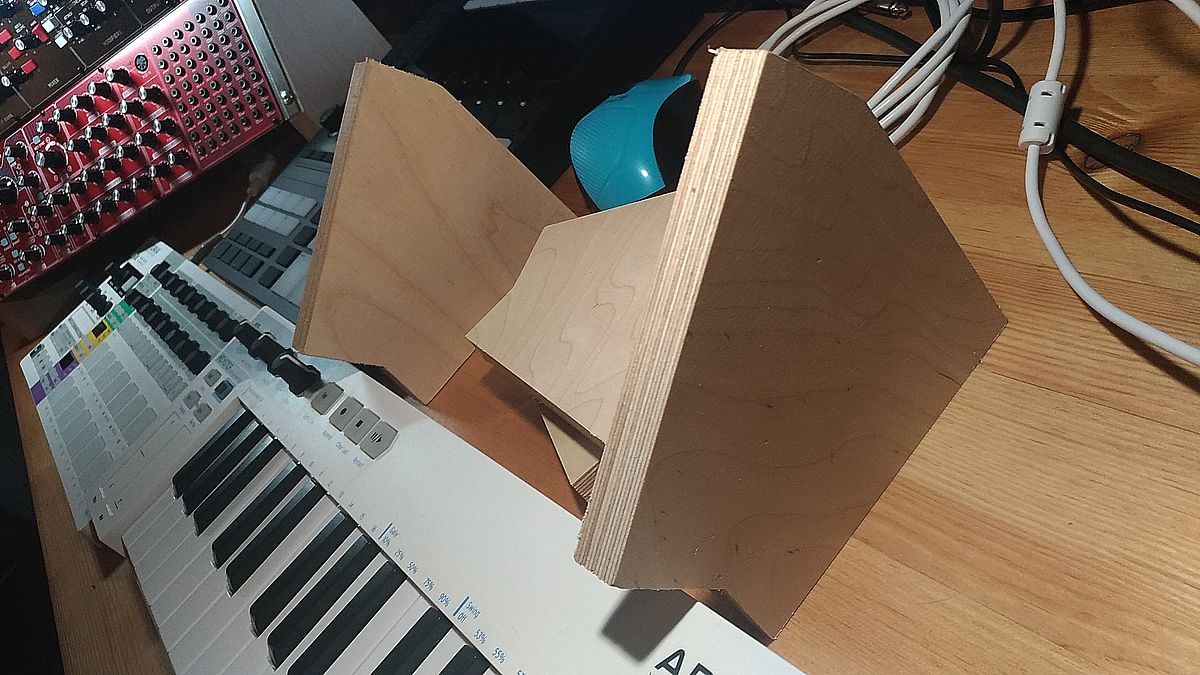 Еще вот такие боковины сделал, идея, думаю, понятна. Провода не мешают, синт вплотную, всю площадь на столе не занимает. И наклон морды побольше.