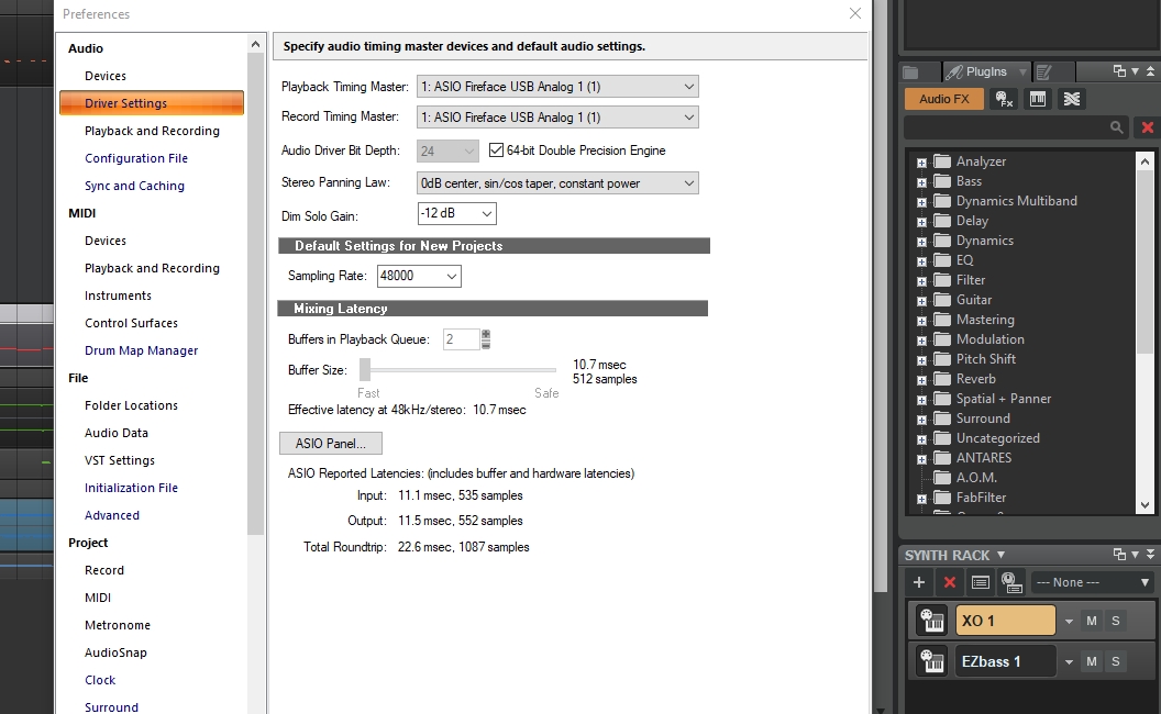 Поставьте в настройках карты (ASIO Panel с Вашего скрина) - 128 и будет все отлично с задержками. Хотя синтюки синтюкам рознь - можно и одним синтом со сложным патчем и оверсемплингом ASIO на лопатки положить.