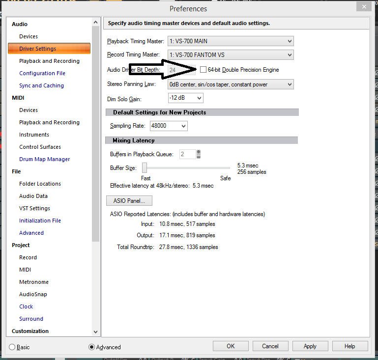 Так мыж с тобой, коллега в одной возрастной категории - мне только что и столько же))) А по поводу трогать или нет - если в проекте дорожек не много, то нет смысла в двойной точности. А вот 20-30-40 и более дорожек при микшировании в 32 bit float, я бы включал - там уже будут накапливаться ошибки вычислений. 64-bit Double Precision - уменьшает их количество, что сказывается на качестве микса. Можно почитать статью Дениса Дубровского - станет понятнее https://prosound.ixbt.com/hardsoft/sonar.shtml