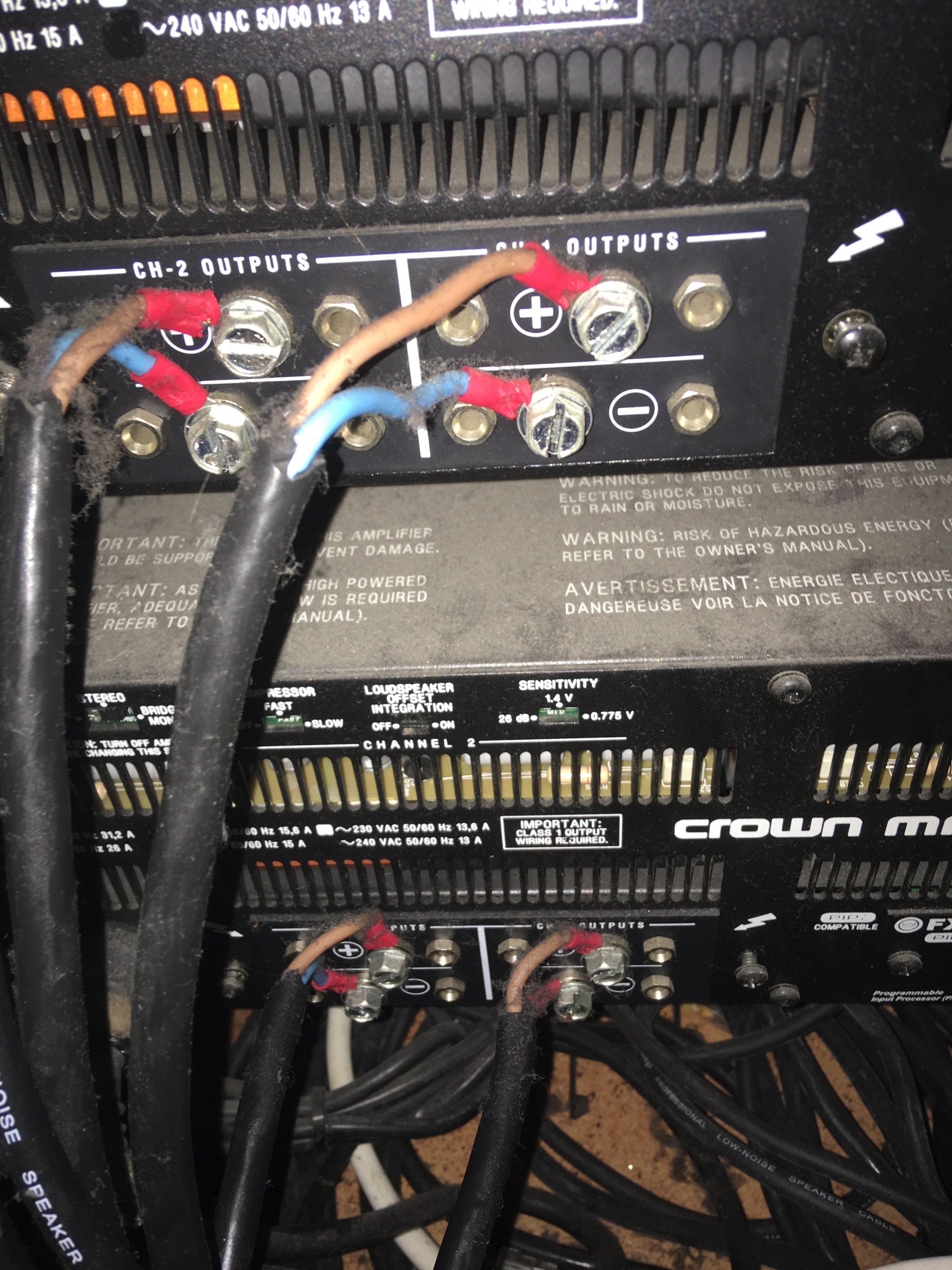 сабы горизонтальные стоят друг на друге по 2 на каждую сторону... серия старая каждый саб 2400Вт по 2 динамика 18" 1200Вт... усилители crown xt4000... если смотреть на сцену то проблема с левой стороной.... по сути сцена симетричная и сабы находятся симетрично... правые сабы давят, на расстоянии 2-3 метров чувствуется достаточное давление... слевой стороны отходишь на 1-2 метра и давления нет вообще..слышно сателлиты и все.... хотя все динамики работают, но ощущение что сабы работают в себя..... подключены сабы так: левый и правый нижние сабы это левый и правый канал одного усилителя...и верхние л и п ко второму усилителю.... то есть оба левых саба подключены не к одному а к 2ум усилителям.... по работе динамиков создается ощущение противофазы..... пробовал двигать сабы ближе дальше +20 -20см и ничего толком не меняется.... расстояние от саба до задней стенки примерно 1-1,5 метра.... зал примерно метров 50 квадратной формы купольного типа.