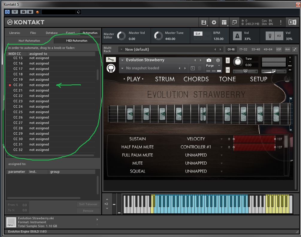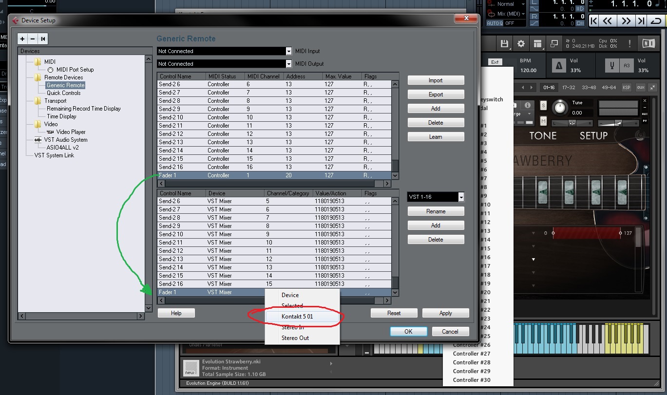 . Но как фейдер на миди клавиатуре приконектить к этому "CONTROLLER#1". Открываю "Generic remote", прослушиваю мой фейдер("Learn"), дальше пытаюсь назначить, вроде как нахожу Kontakt 5 из выпадающего списка