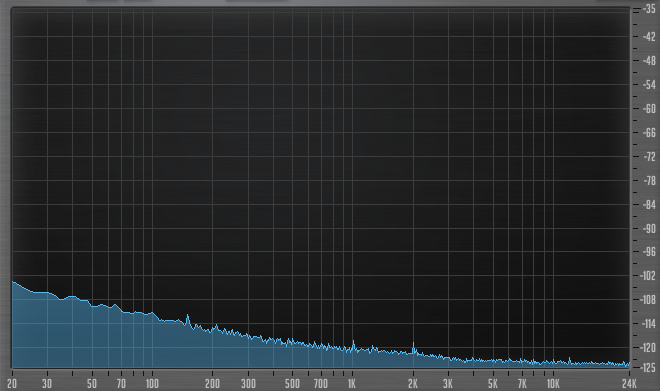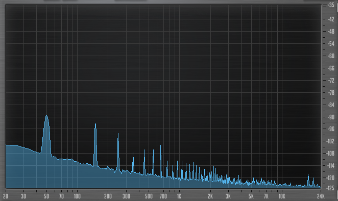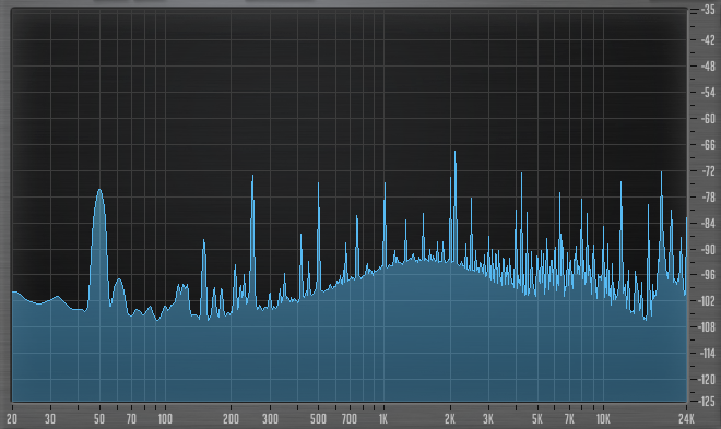 Это обнажило ещё одну проблему. На графике отчётливо видны гармоники кратные 50Гц. Импульсный БП, пусть и подключённый через разделительный трансформатор, такое выдавать в принципе не может. Подозрение пало на кабели. Так и оказалось. Заменил на более качественные и вот: Спектр шума с хорошим кабелем.png