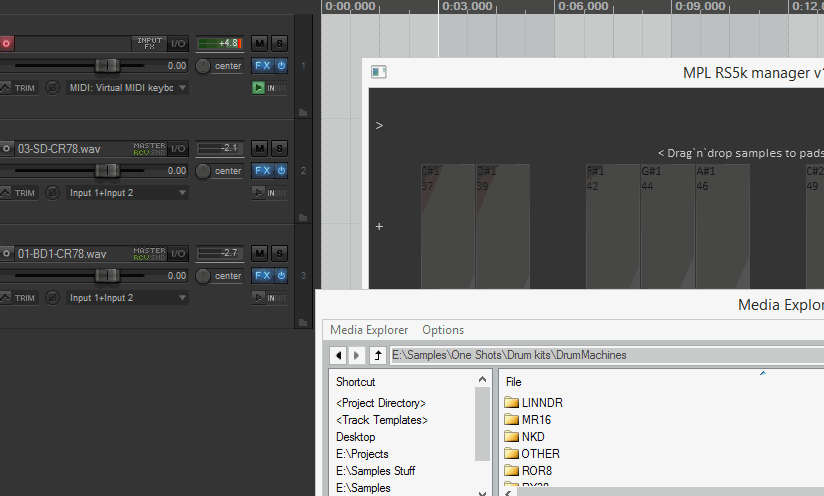 RS5k manager - это lua скрипт для REAPER, позволяющий управлять инстанциями ReaSamplomatic5000 на выделенном треке и его MIDI посылах. Другими словами, приближающий классический FX chain Рипера к виду сэмплера ударных.