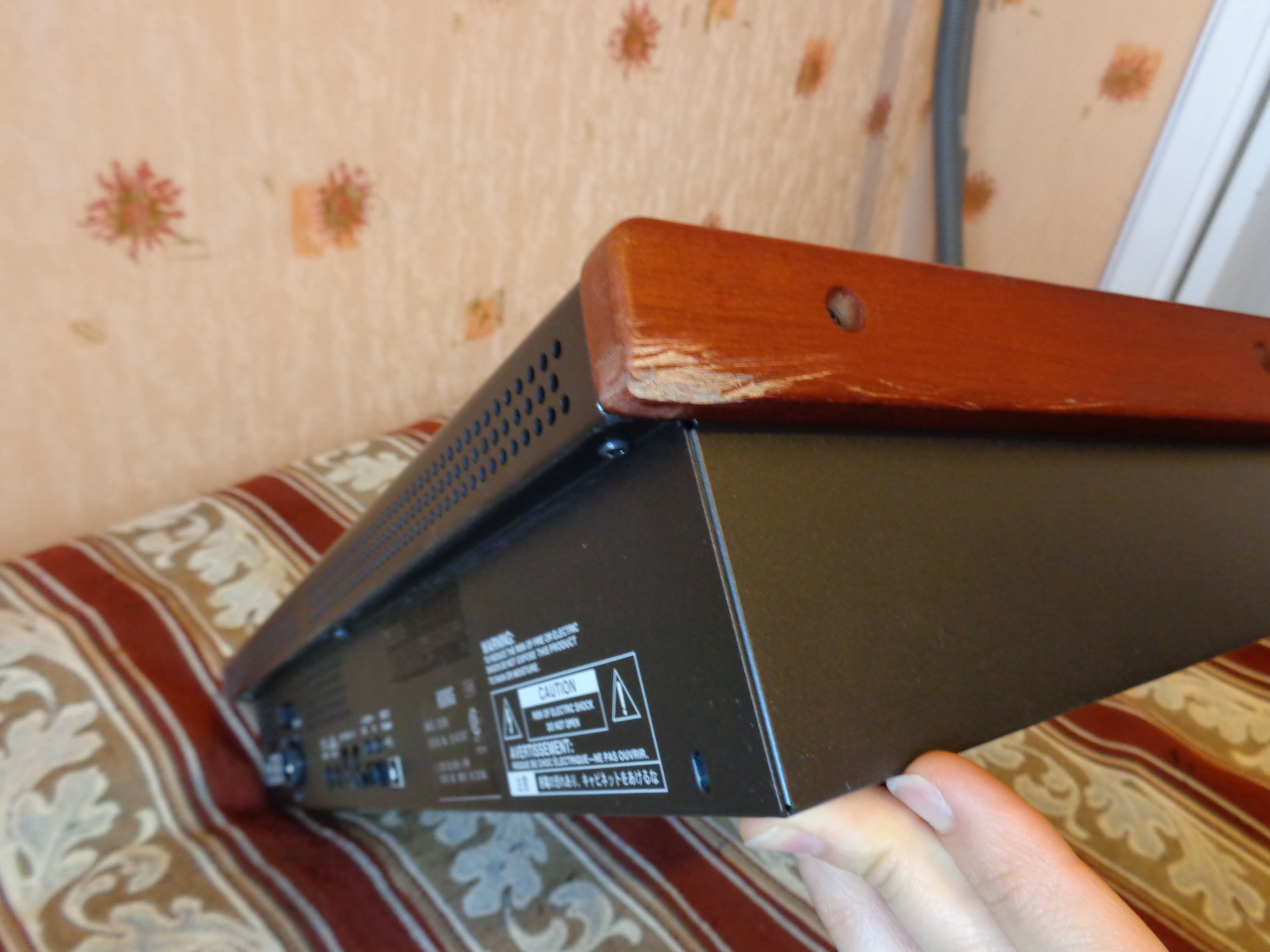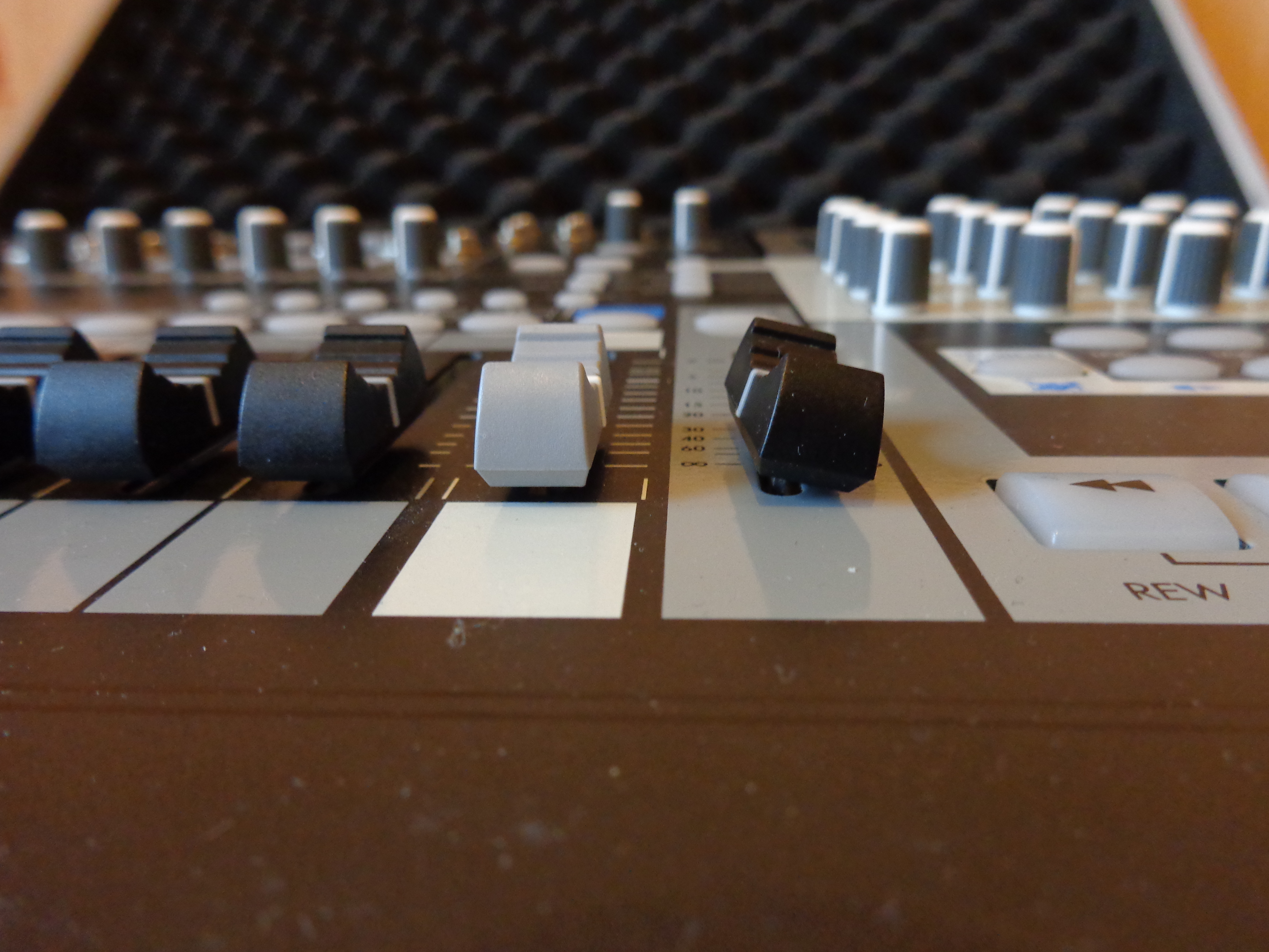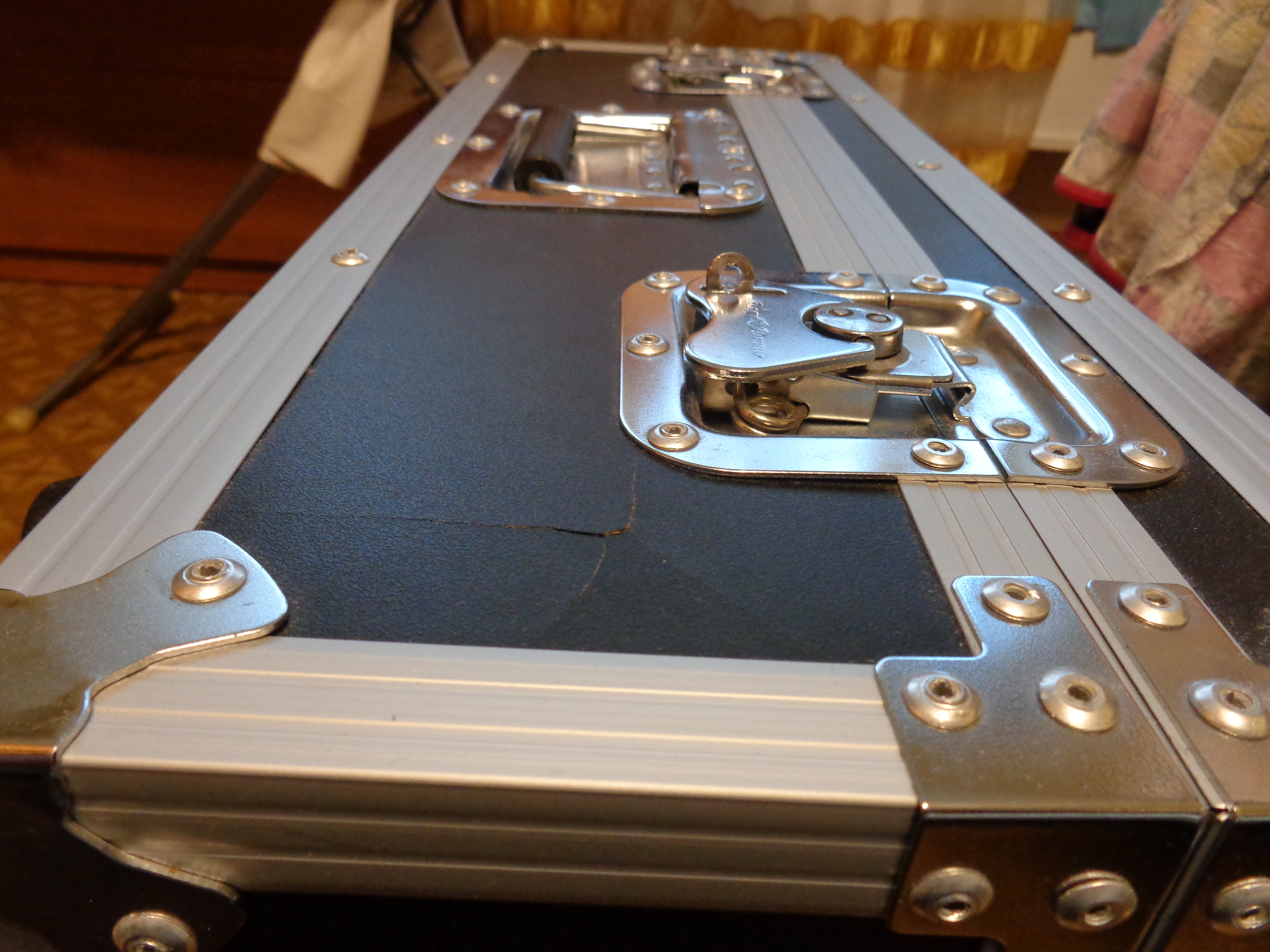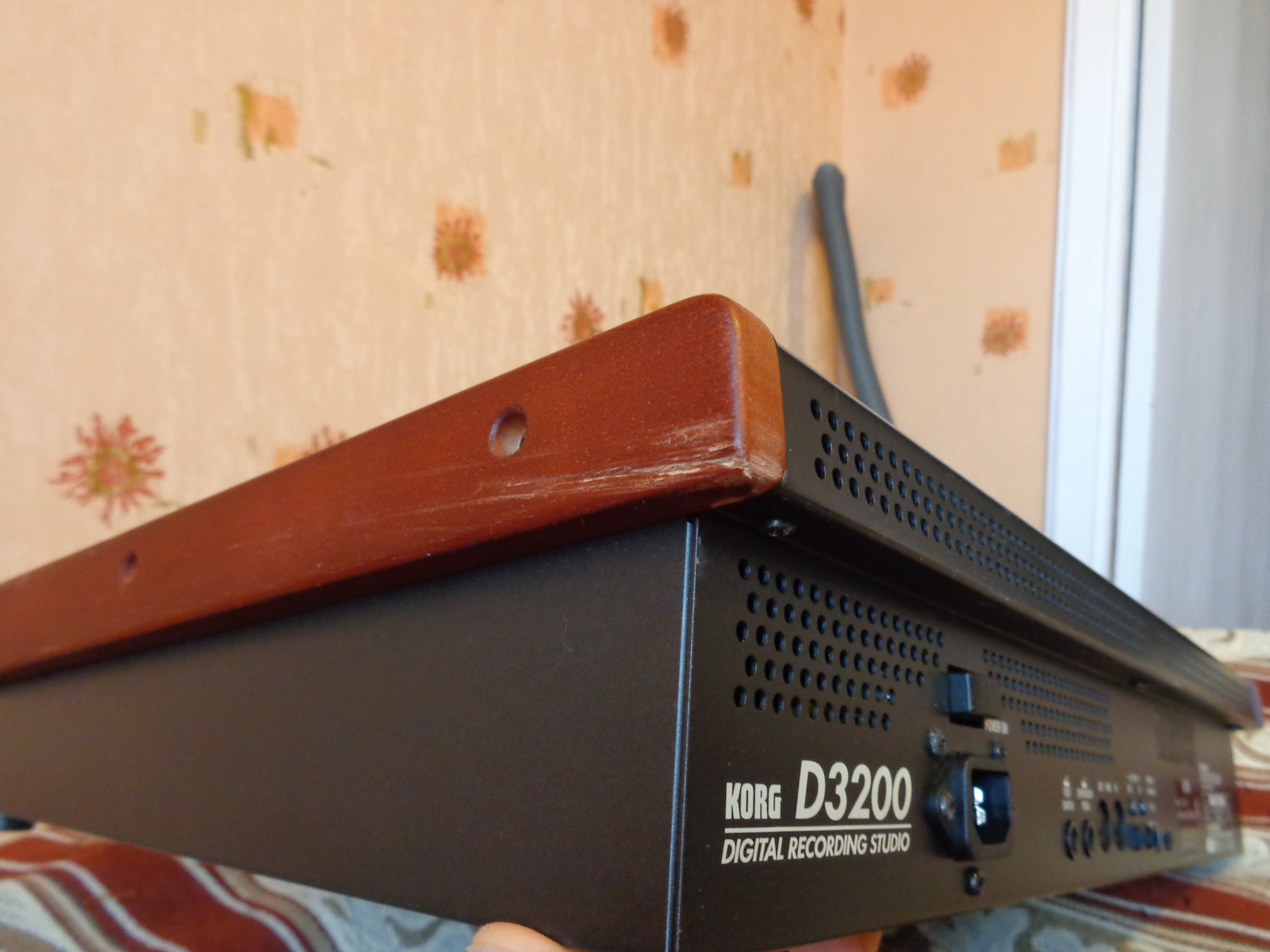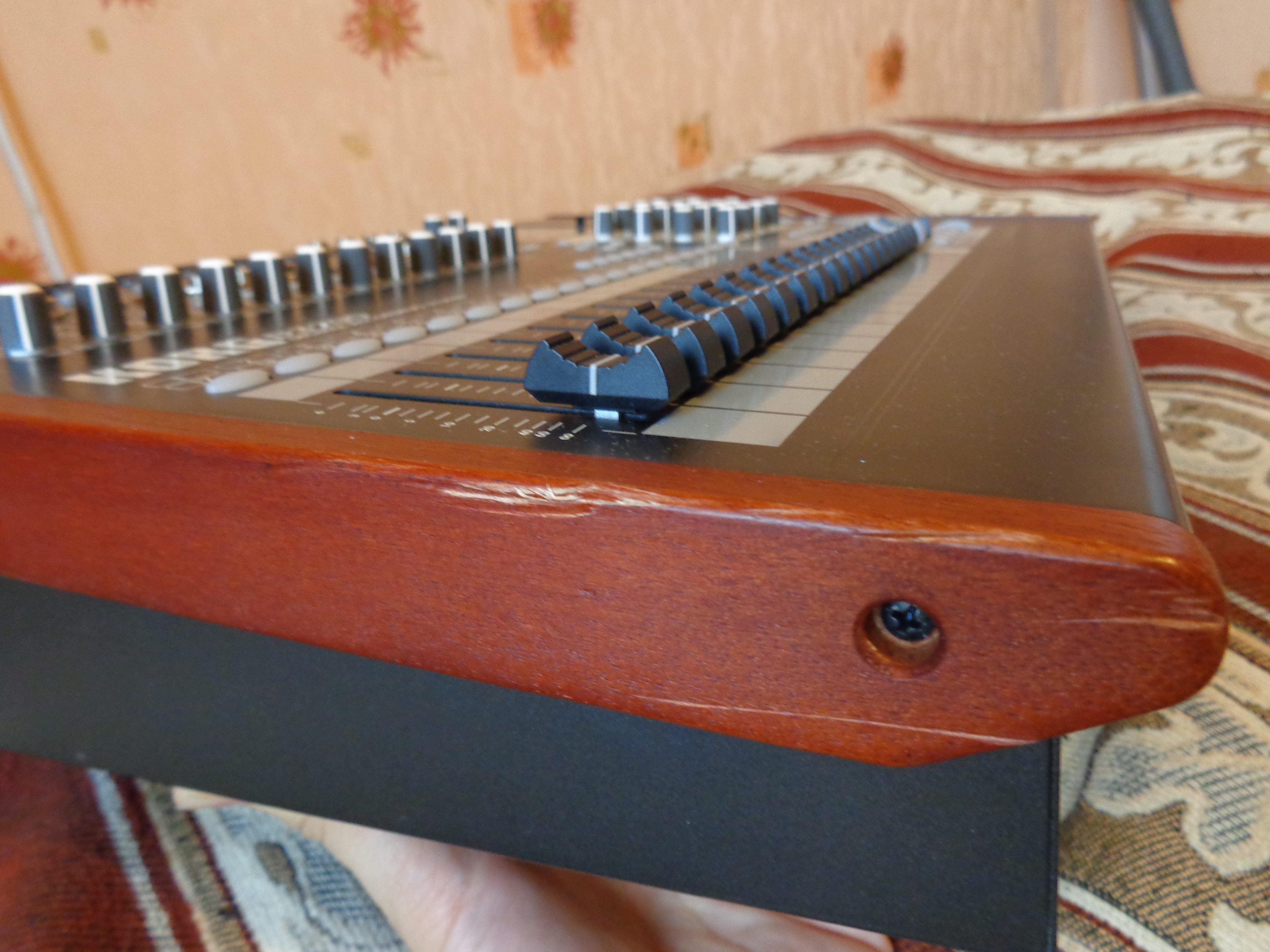 К сожалению, предыдущий владелец не зафиксировал портастудию в кейсе, поэтому при транспортировке до меня она получила косметические повреждения: погнулась ручка фейдера и повредились деревянные боковины о металлические части кейса.