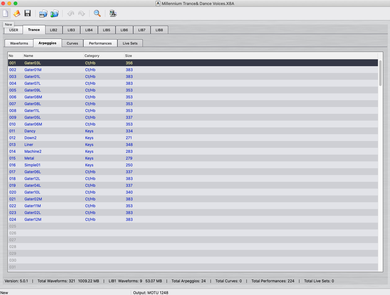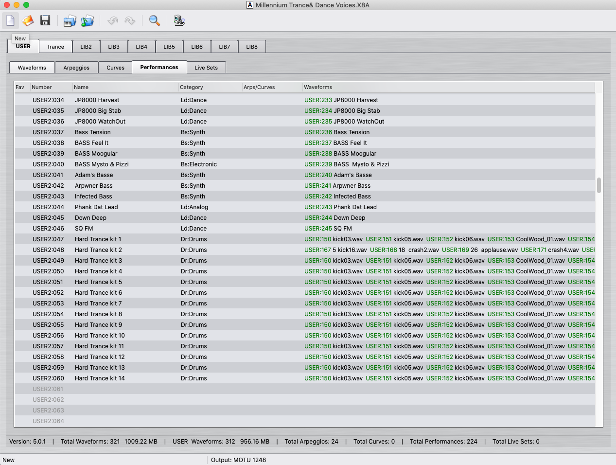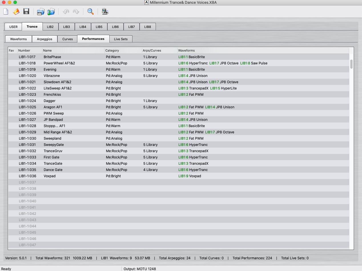 Весь основной контент у него в папке USER. А в папке Trance - только часть. Вероятно, которые он сделал с арпеджио. Ведь и арпеджио тоже есть в этой библе. 24 штуки. Волновых форм - 9. Перфомансов - 36. В USER-папке 2 банка - 128 и 60 пресетов. Волновых форм - 312. Без арпеджио.
