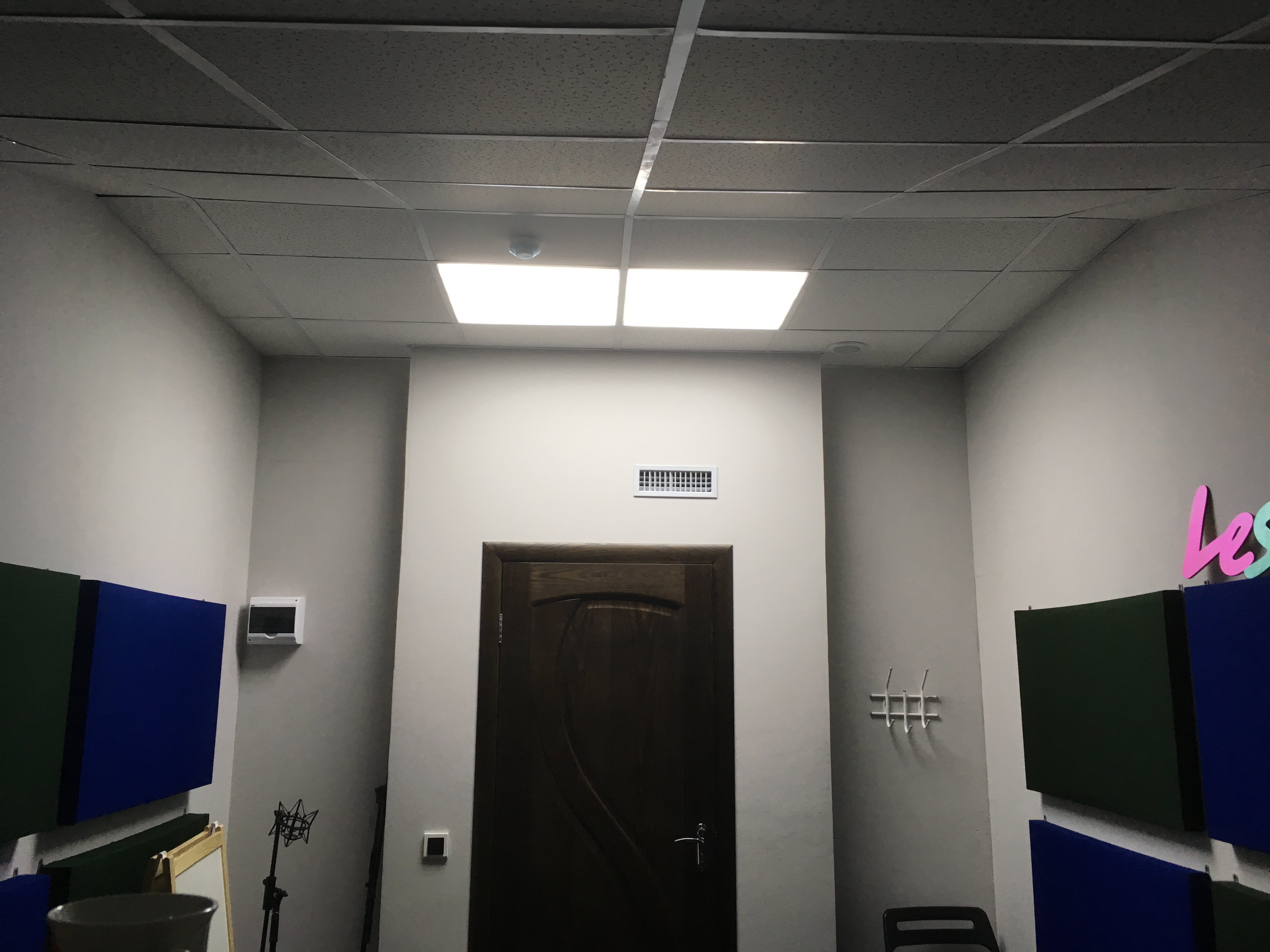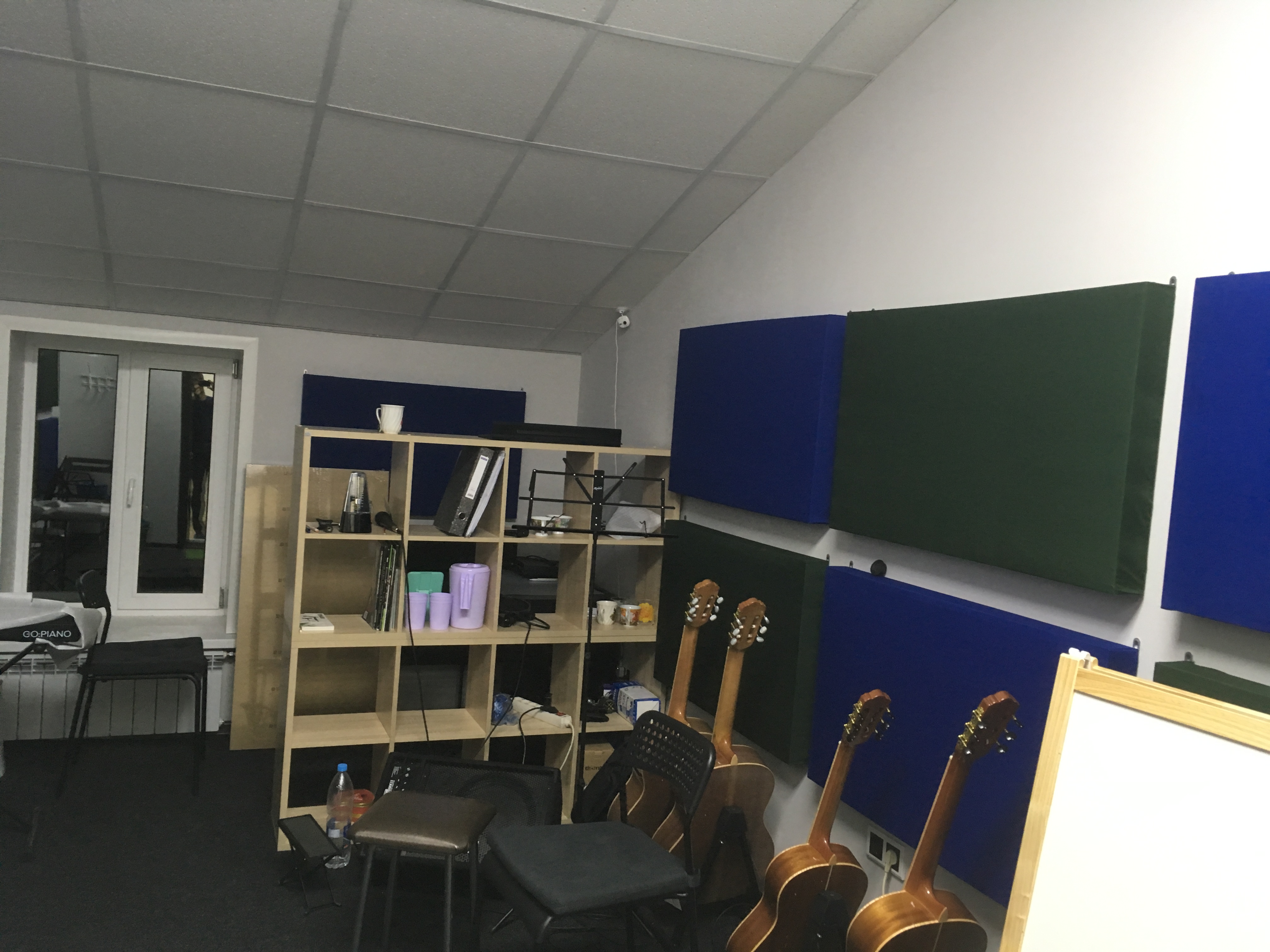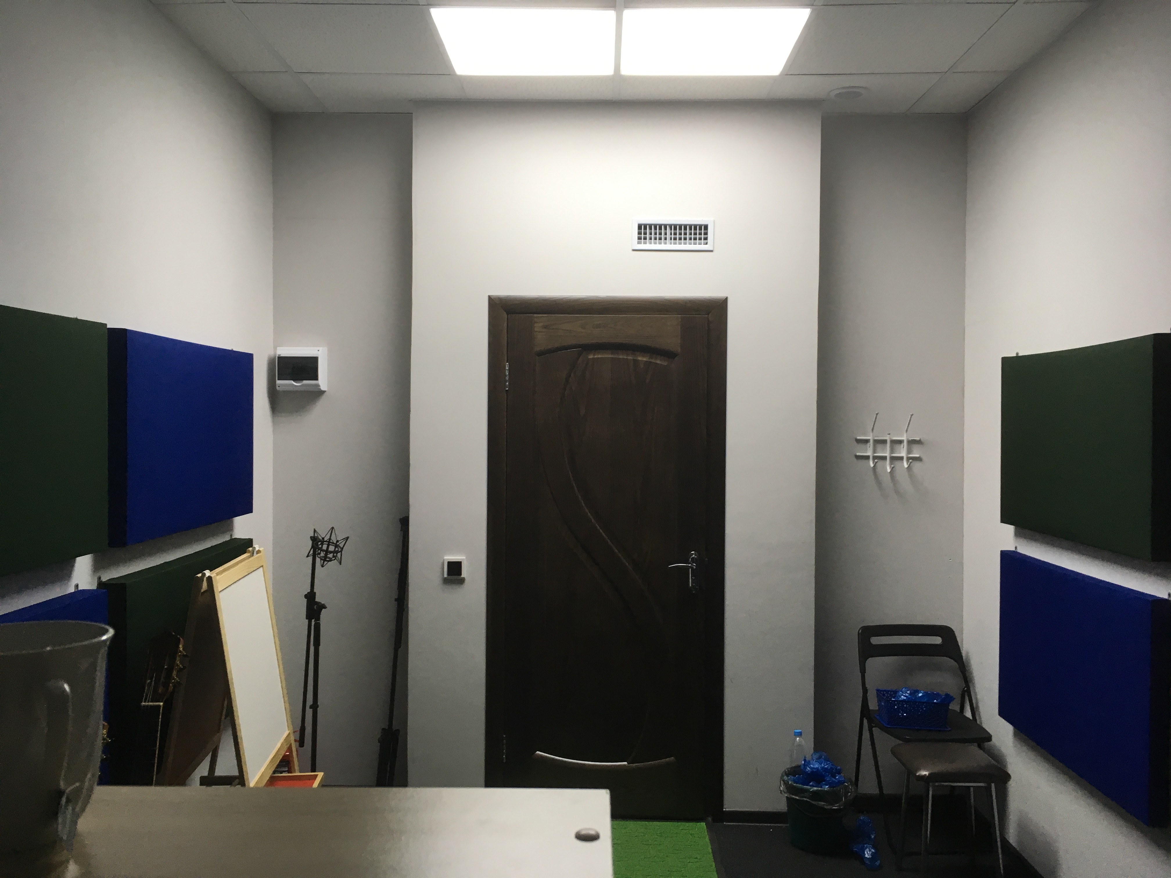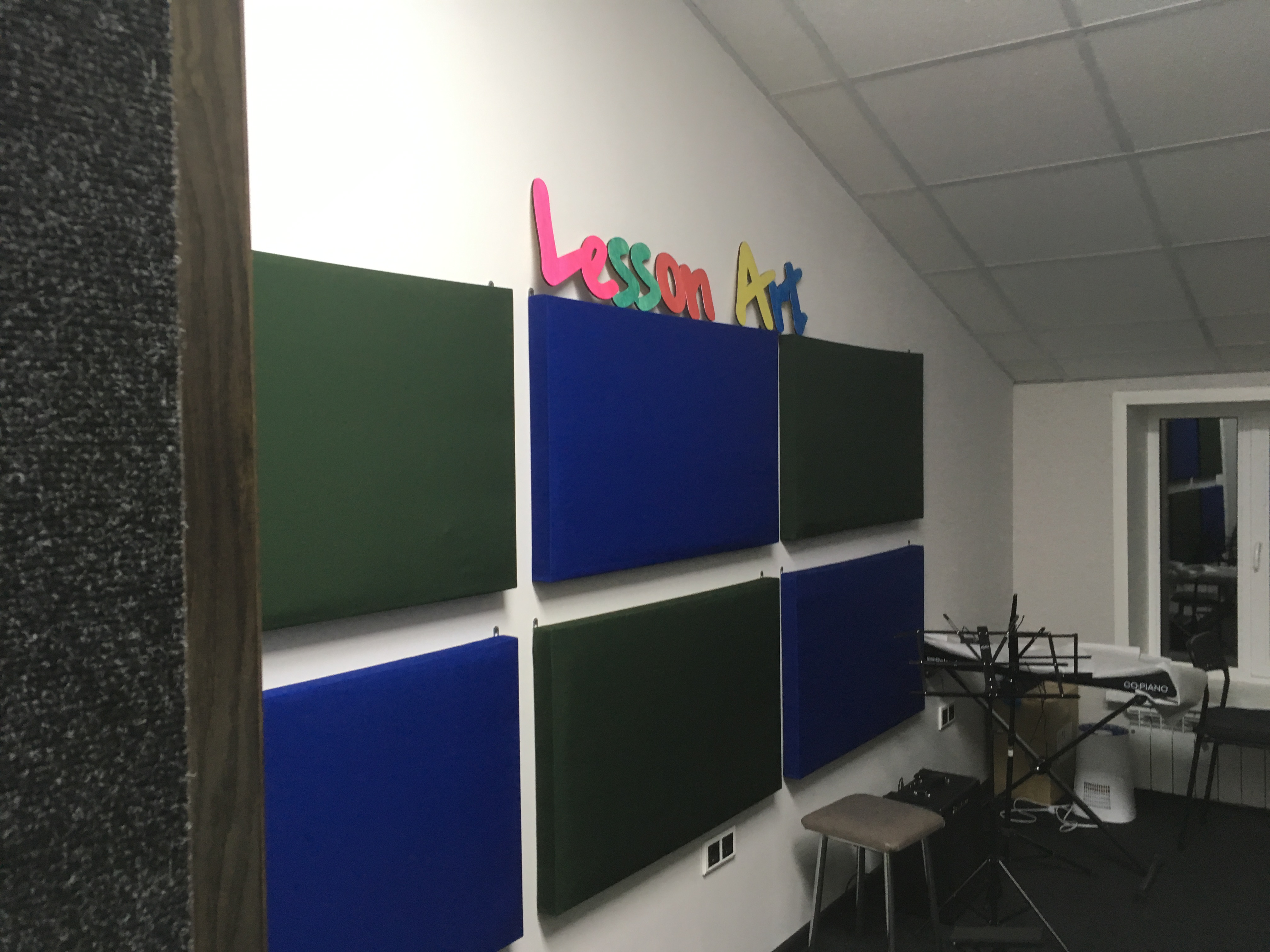 Площадь помещения 13кв. Панели деревянный каркас 600х1000. Толщина с одной стороны 100мм с другой 50мм. Наполнитель кнауф акустик батс. По длинным сторонам: с одной стороны 6 толстых панелей, с другой 6 тонких. Со стороны окна две панели, со стороны двери пусто.