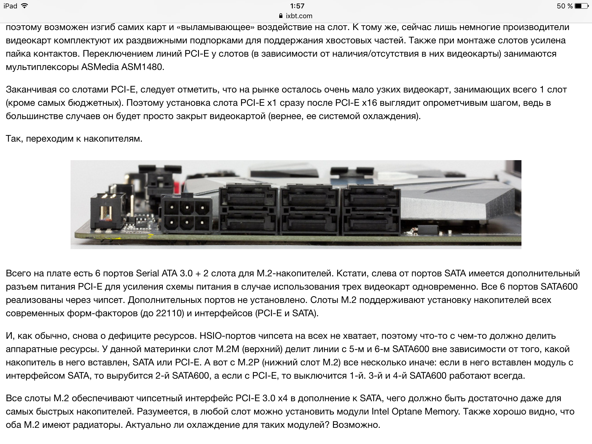 @Dmitry Stepin, у тебя есть выбор: Использовать видеокарту на 8ми линиях, а в оставшиеся 16x слоты вставит нужные тебе контроллеры/переходники для SSD. А это ещё по 4 линии. Или так не даст контроллер/ переключатель сделать?