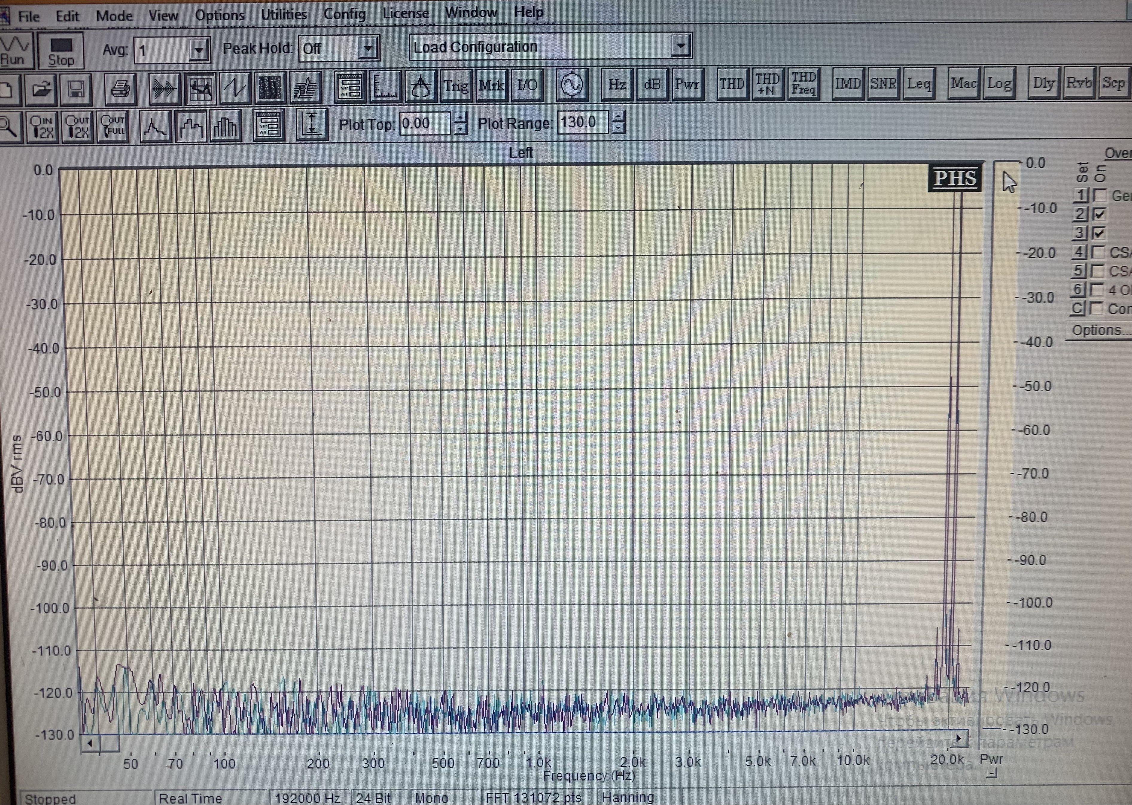 И сам стенд: осциллограф с показаниями 40В пик-пик, нагрузочный резистор 4Ома, и комп со спектрой, полоса захвата АЦП - 96КГц, тактирования - 192КГц.