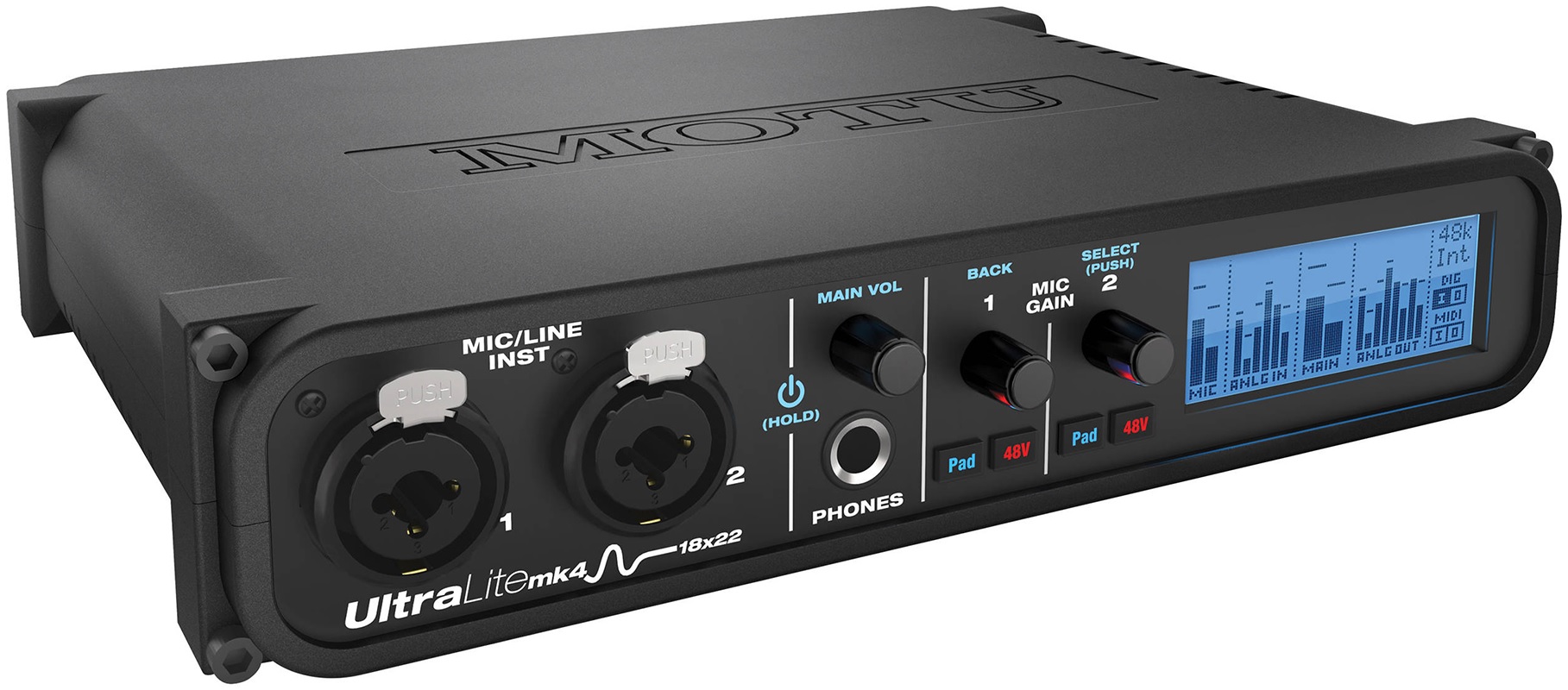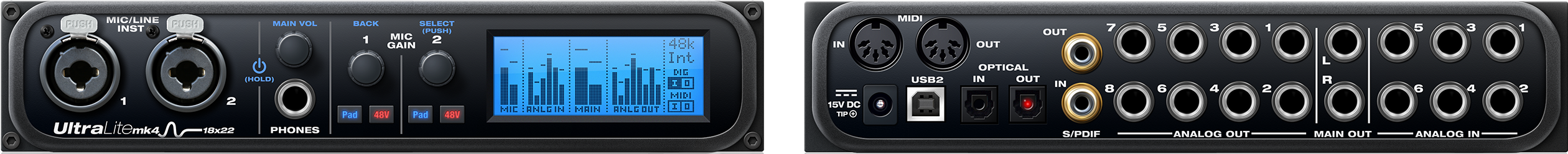 2 микрофонных/инструментальных, 6 линейных, 10 линейных выходов, выход на наушники, оптика, S/PDIF, midi in/out, может работать в режиме standalone.