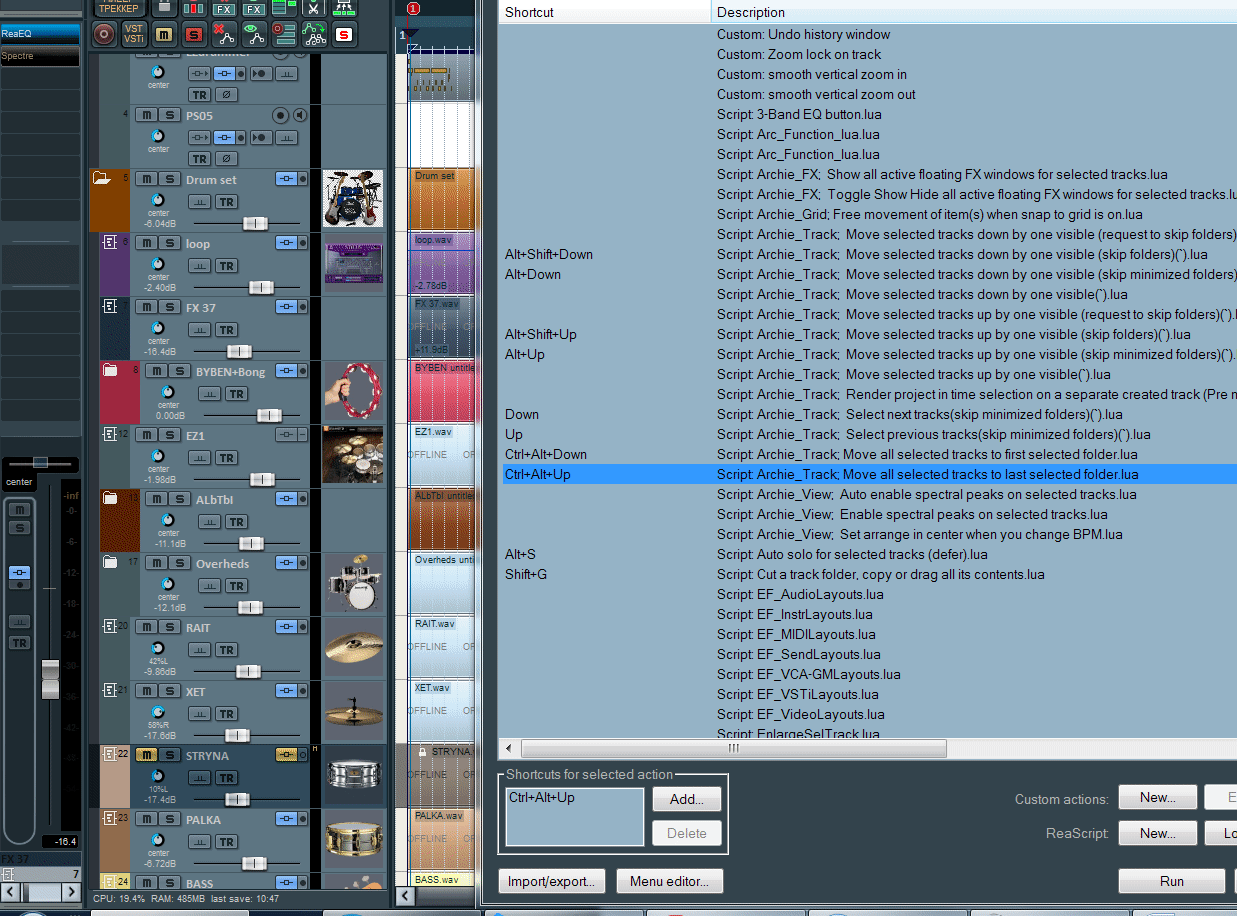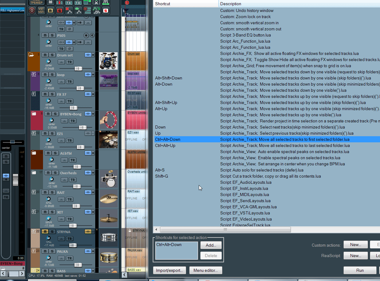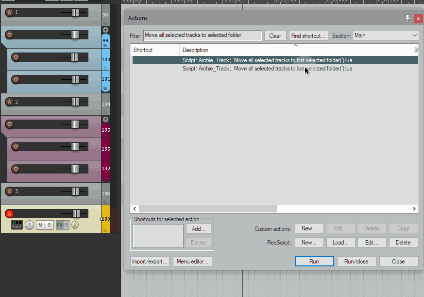 Вот вопрос с такой парой скриптов: Move all selected tracks to last/first selected folder... Назначено у меня сочетание Ctrl+Alt+Up - перемещает треки (last) в последнюю выбранную папку, а Ctrl+Alt+ Down - в первую (first) выбранную. Может я что то не так понял, ну и пользовался, в основном одним Move all selected tracks to last... А тут, при монтаже понадобилось first и вдруг заметил, что эти оба скрипта работают одинаково.