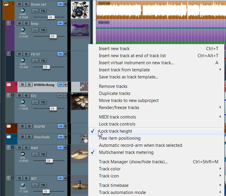 Но после перезагрузки проекта происходит так: открываю "главную" папку (Drum set), выглядит всё хорошо, как и сделал (разница по высоте, между блокированными и не блокированными сохраняется), но стоило крутануть скроллом (Ctrl+колесо (Zoom vertically...)), все внутренние треки и папки стали опять одинаковыми - то есть - не заблокированными...