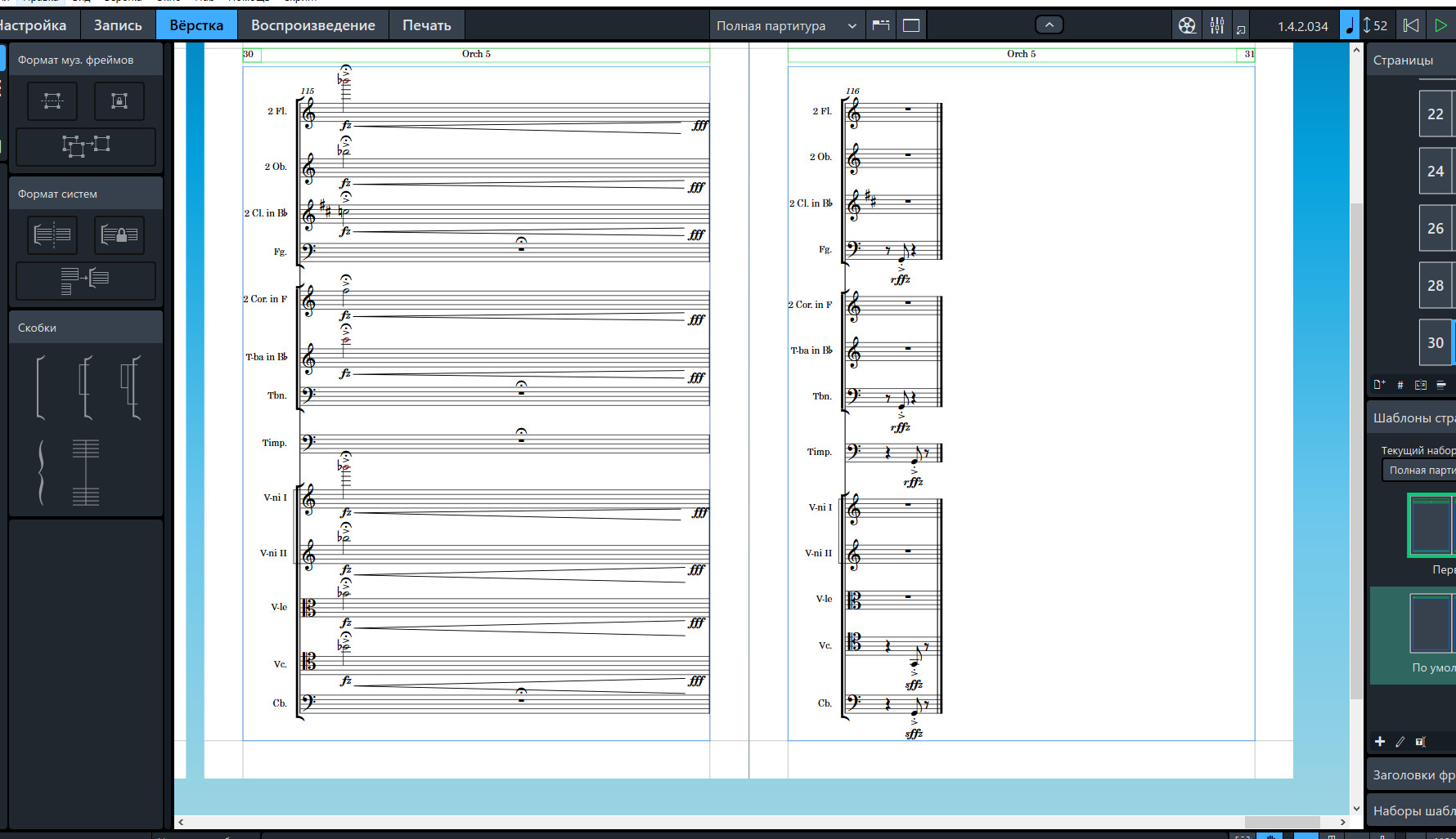 Я перерисовал динамику, а то как-то неаккуратно было. Теперь она в предпоследнем такте представляет собой единый объект «zF < FFF». Чтобы еще больше расширить широкие концы динамических вилок (как у Вас было), выделяем все вилки, включаем в обычном Engrave в нижней панели Hairpin open aperture. Сейчас я поставил значение «2 3/4 spaces», но это от балды.
