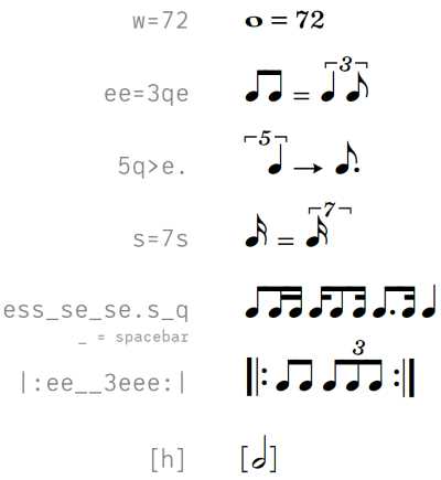 Шрифт Metrico. Если вам требуется набрать ритм вне нотного стана, как текст – например, обозначить переход на Swing, – то шрифт Метрико вам поможет. Несколько примеров на картинке (символ подчеркивания на схеме означает пробел):