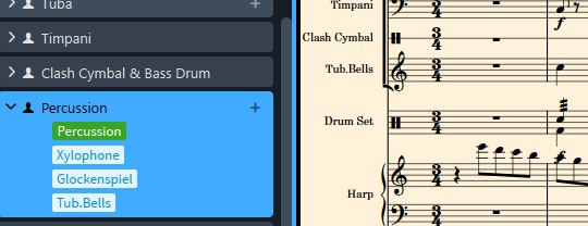 Думаю, что никак нельзя, группе инструментов (пока?) нельзя давать своё имя. Первым играет Tub.bells, он и показывается. Так и должно быть, дирижёра не волнует, как между исполнителями распределяются ударные инструменты, а волнует только, чтобы конкретный инструмент прозвучал вовремя.