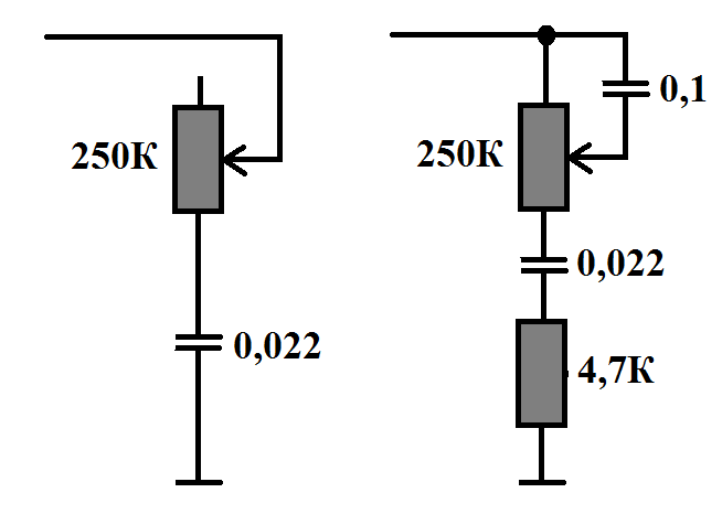 Ощущение подвала низов просто не получается , как я не кручу тон в обычной схеме. Хамбакеры превращаются в мутное гуано. А тут получается легкий, « слепой» звук, очень хорошо сохраняется артикуляция в с середине. Повторяю: я не теоретизирую, -я спаял и не просто спаял, а еще и номиналами поиграл. От 0,01до 0,1мФ. Работает в при любом номинале практически. Возможно, фиксированно можно поймать в обычной схеме что-то подобное, но это как пальцем в небо, одна рабочая точка . А здесь появляется некая вилка , где этот эффект очень полезно и плавно регулируется. В сочетании с регулировкой громкости, особенно если применяется требл-блиид, это даст целую гамму интересного ( у меня обычкая громкость, логарифмическая, и то я ощутил реально, что мне хочется наконец пользоваться темброблоком в гитаре для формирования звука, а не только как wah-wah в отдельных случаях.