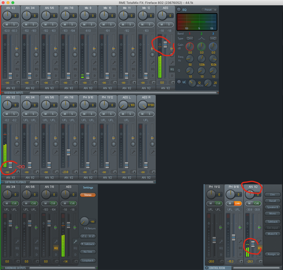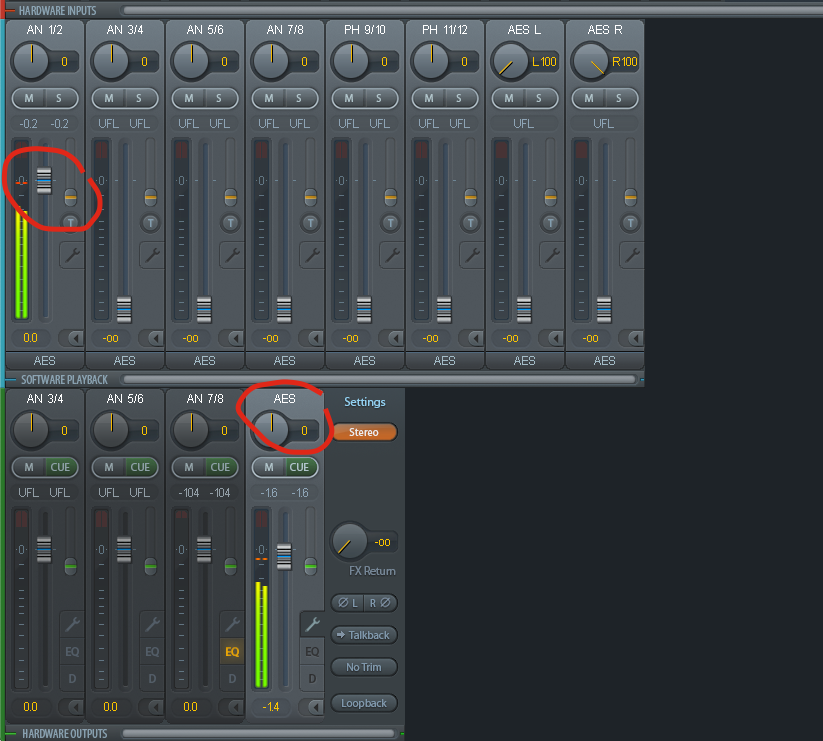 Теперь клацаем на канал main out (у меня это AN 1/2). Здесь важно, что сигнал будет приходить только с AES лупбэка. Т.е. ставим канал в Software Playback на минус бесконечность, а AES в Hardware Inputs на 0.