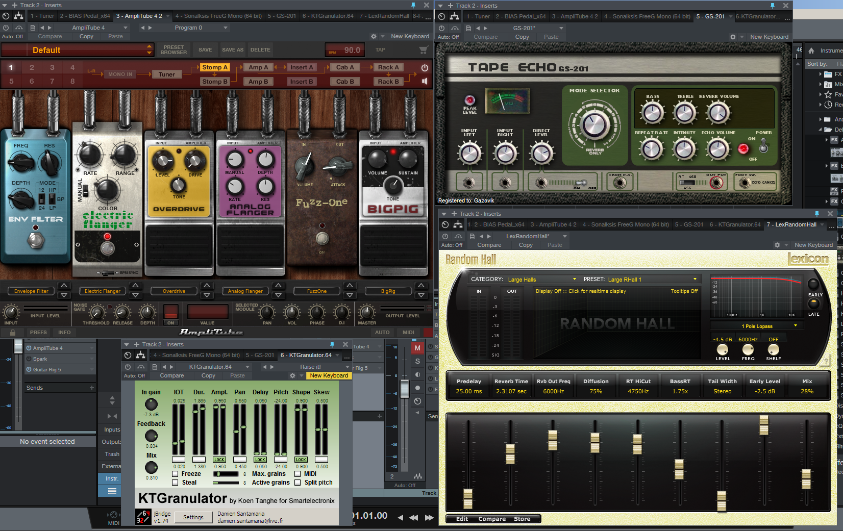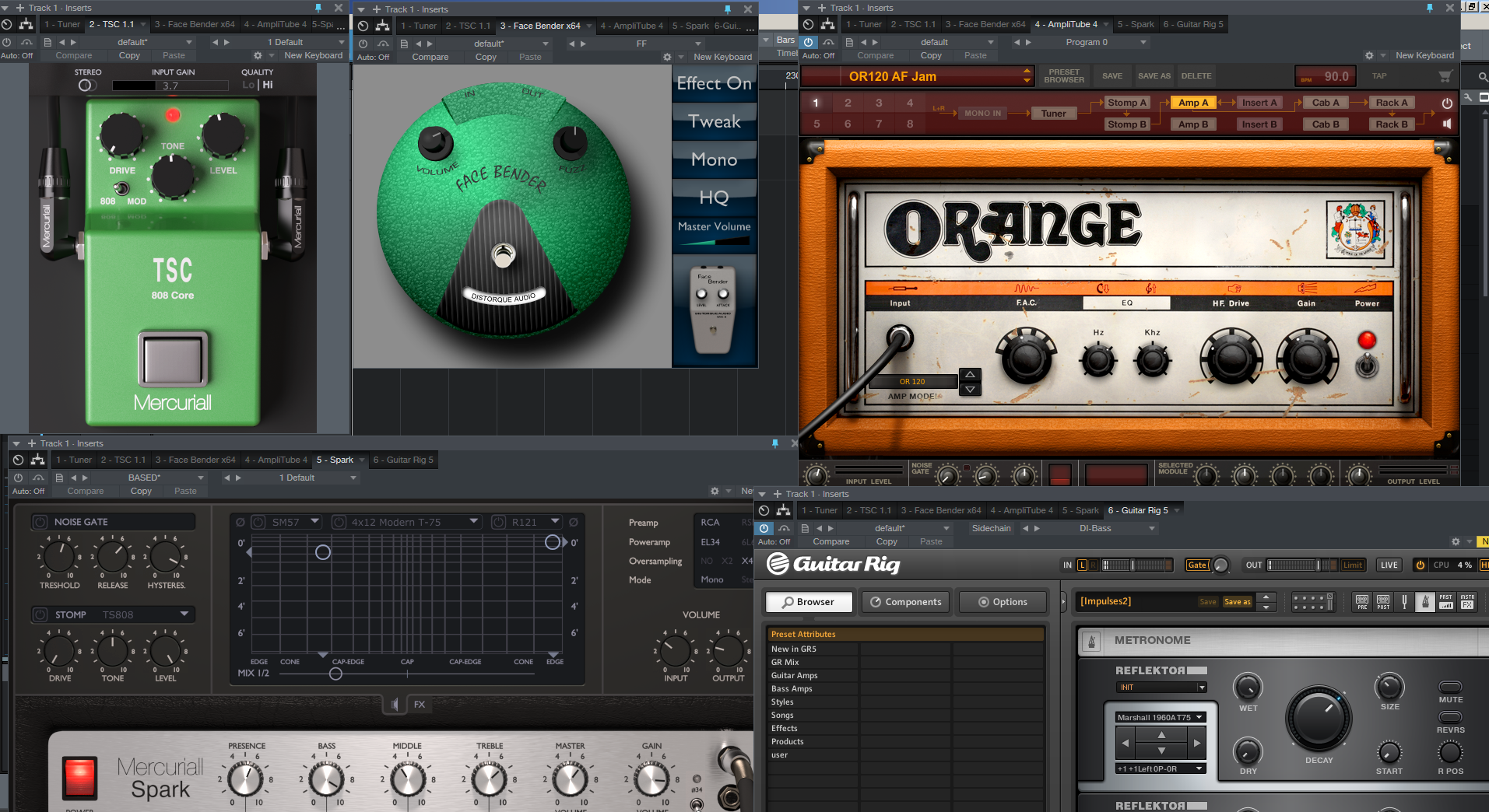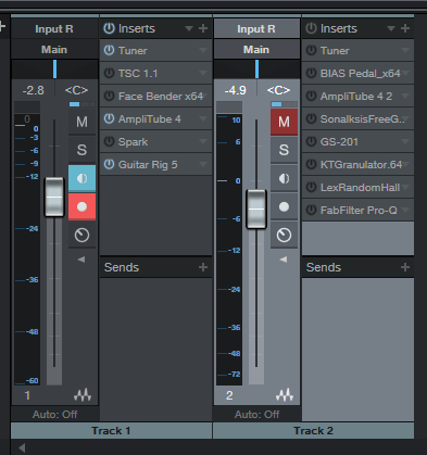 В DAW (сейчас пользуюсь Studio One, но планирую переход на Аблетон) выстраиваю цепочки эффектов из плагинов - от педалей до кабинетов и разнообразной обработки. Делаю все не в одном плагине, а в разных. На скринах - примеры моего сетапа.