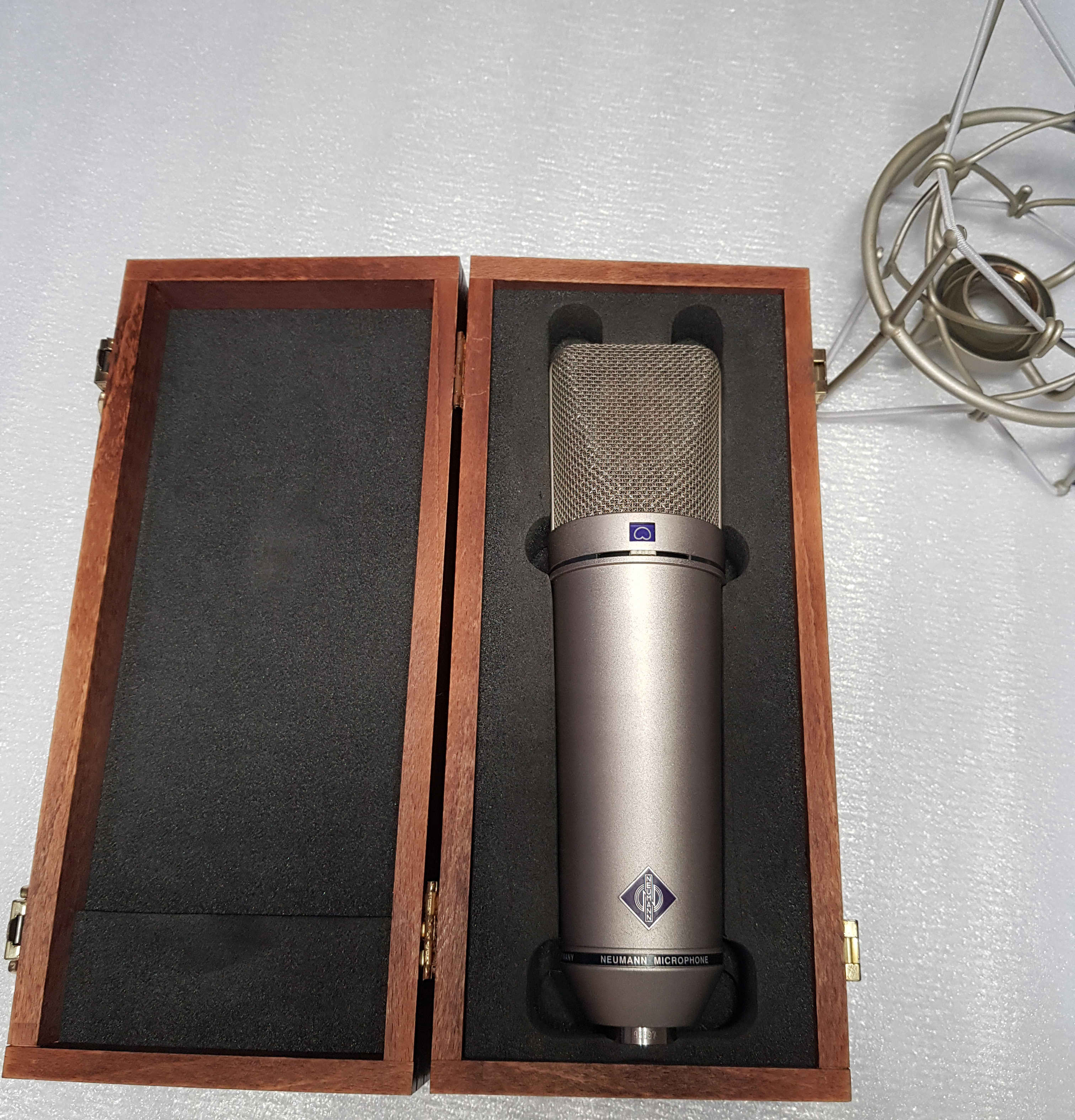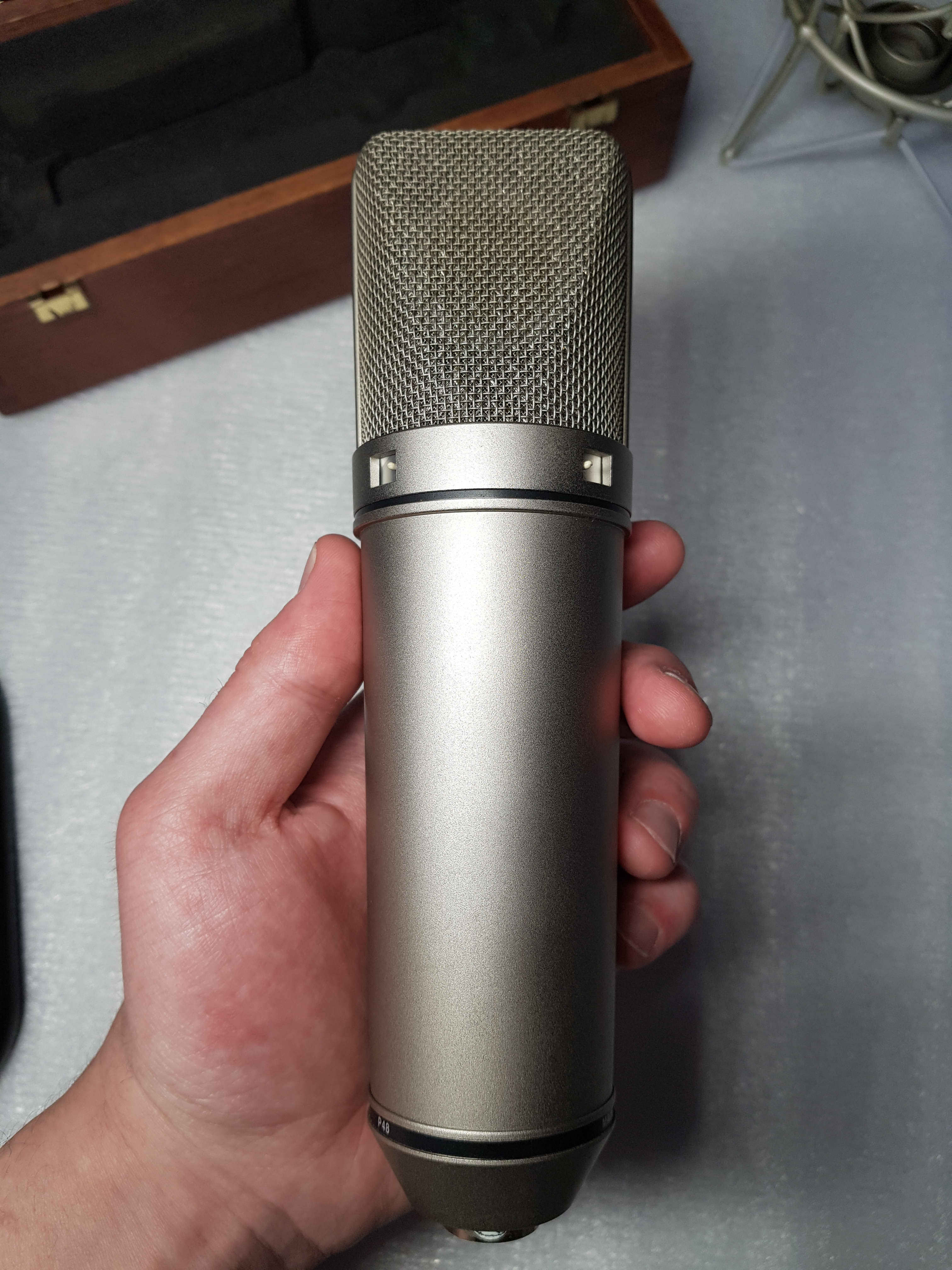 Полный заводской комплект Studio Set - микрофон, подвес Neumann EA 87, деревянный кофр. Состояние отличное. Работает безукоризненно. Использовался только мной, для демо записей, с большим поп фильтром K&M (диаметр 20см) на домашней студии, в не курящем помещении.