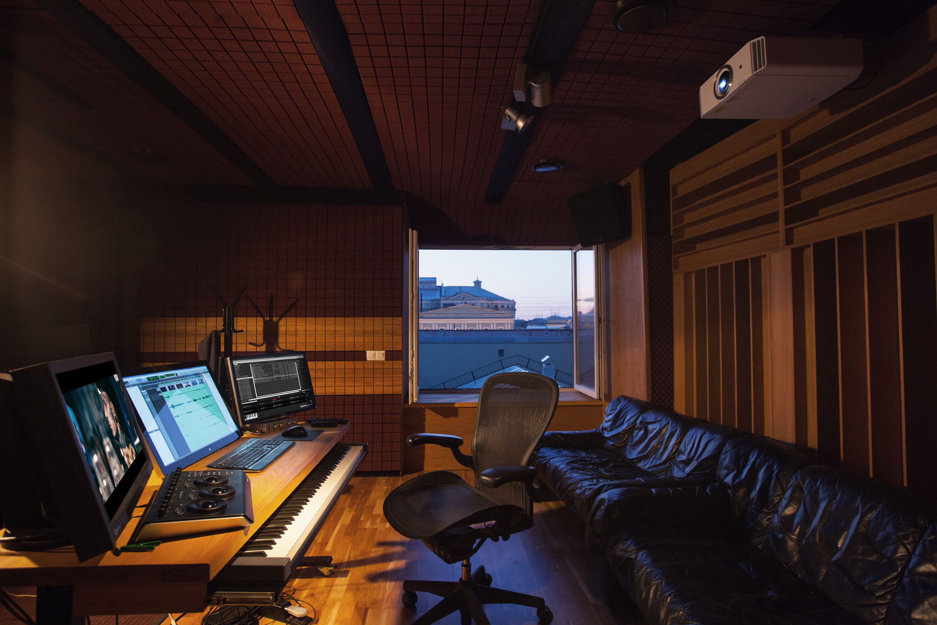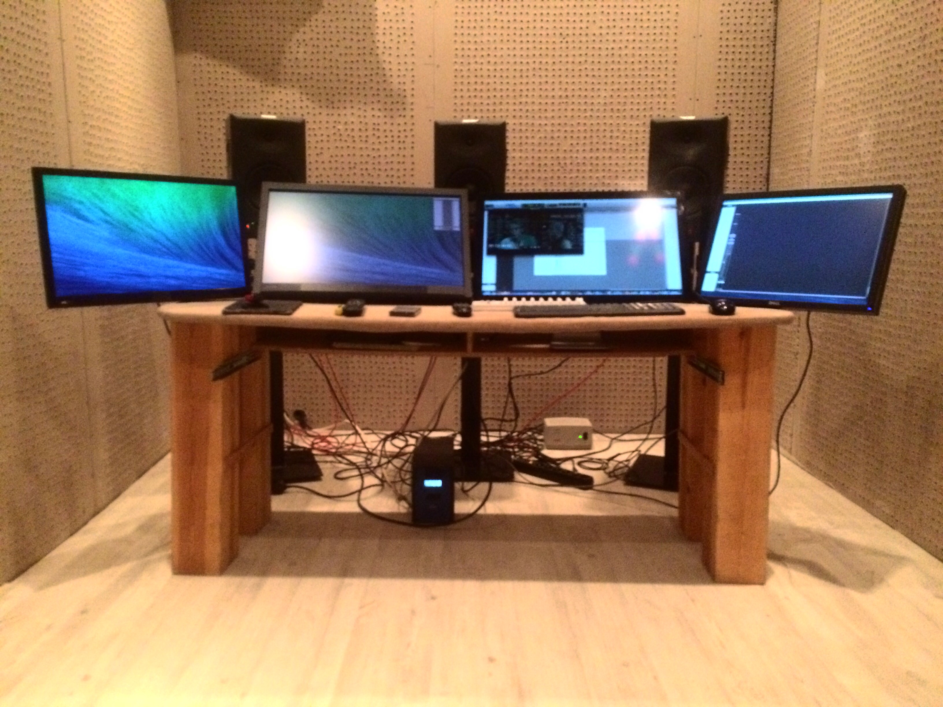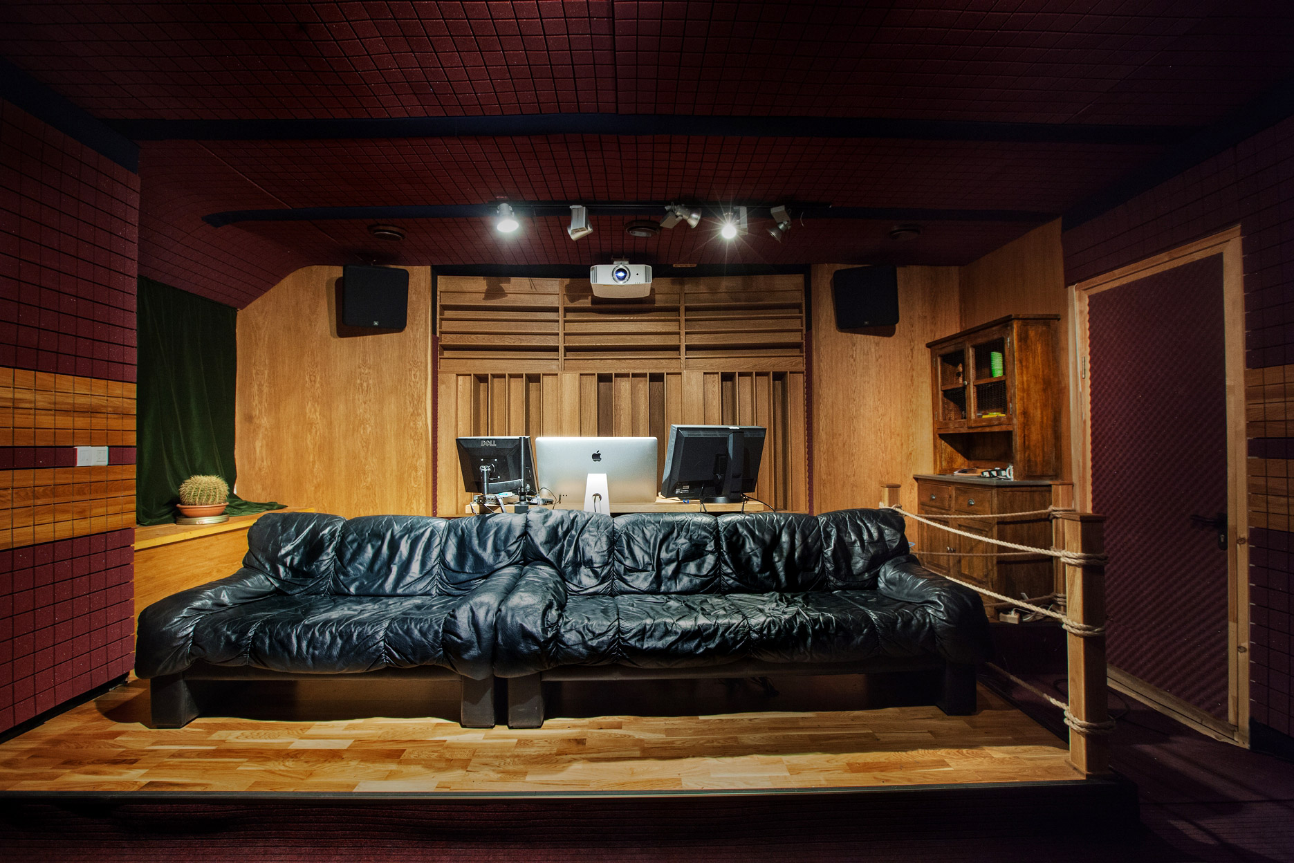 Фронтальные мониторы встроены в стену, за акустически-прозрачным экраном, тыловые висят сзади на кронштейнах. Сводили 5.1 звук и музыку для кино.