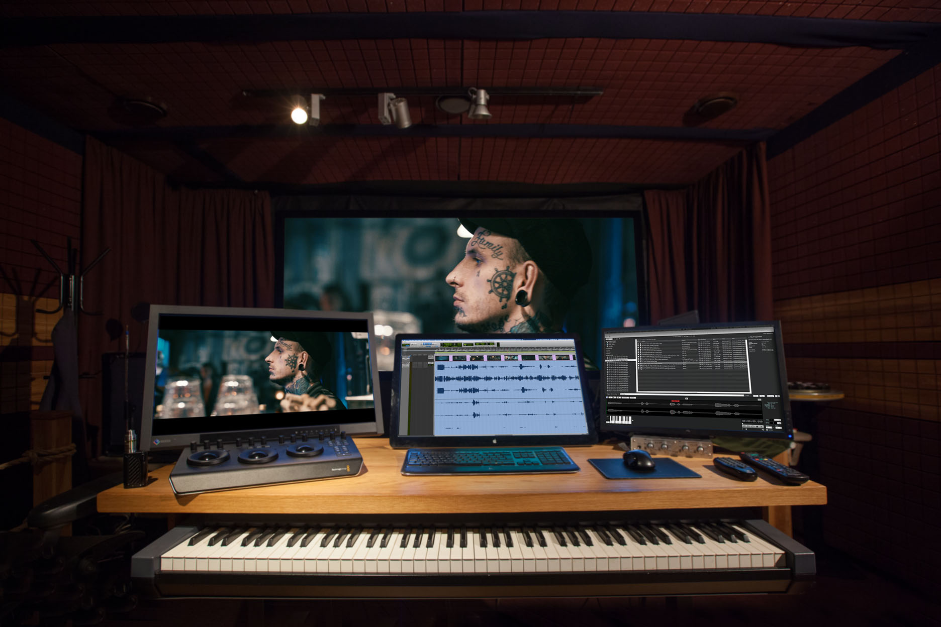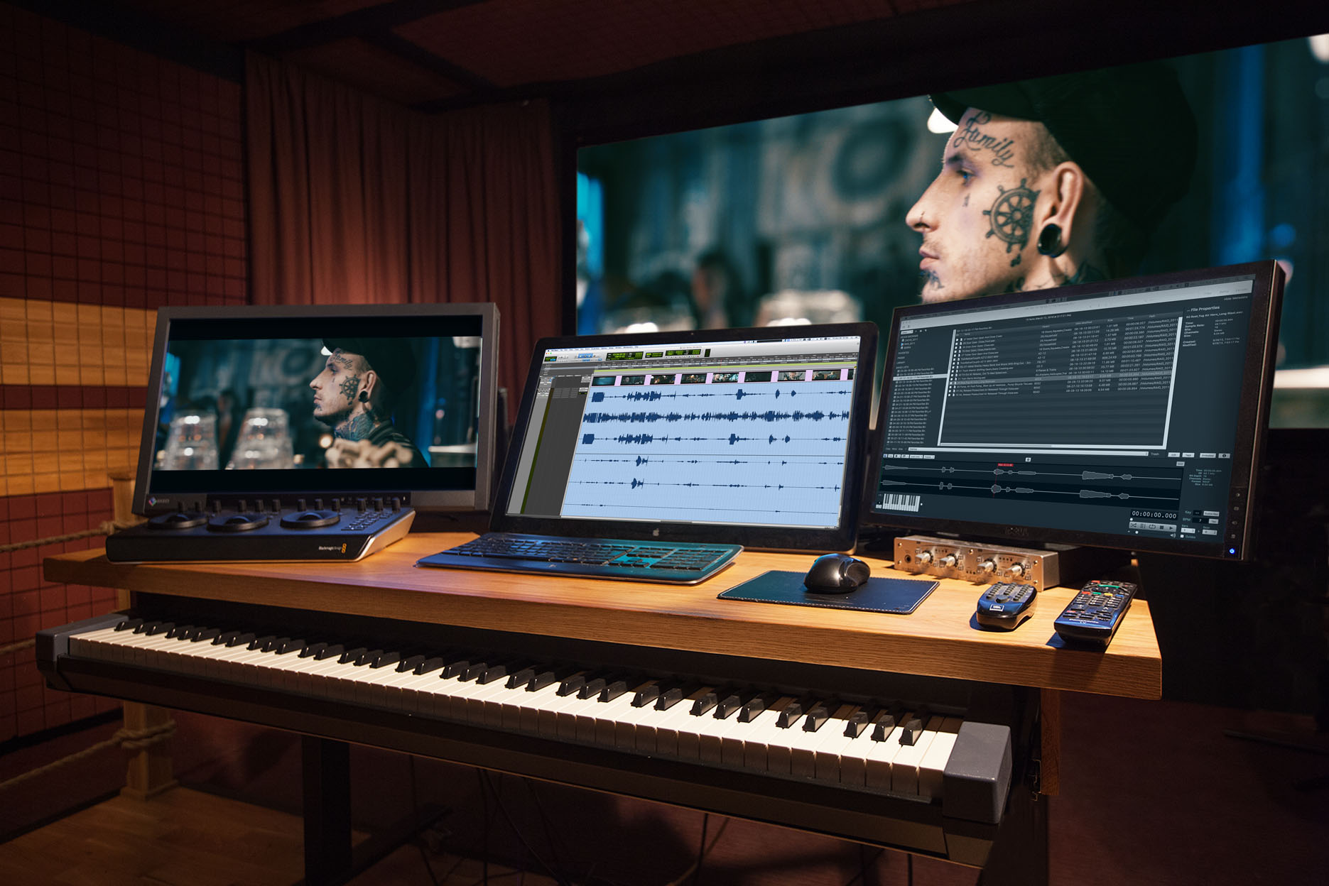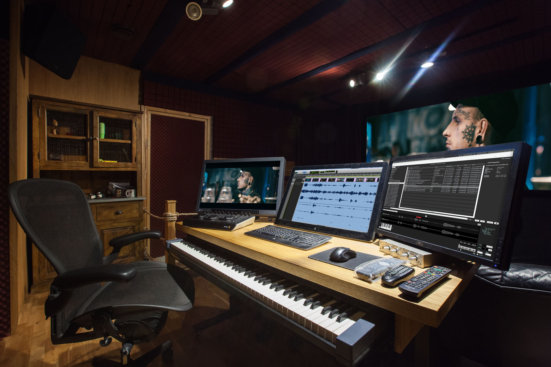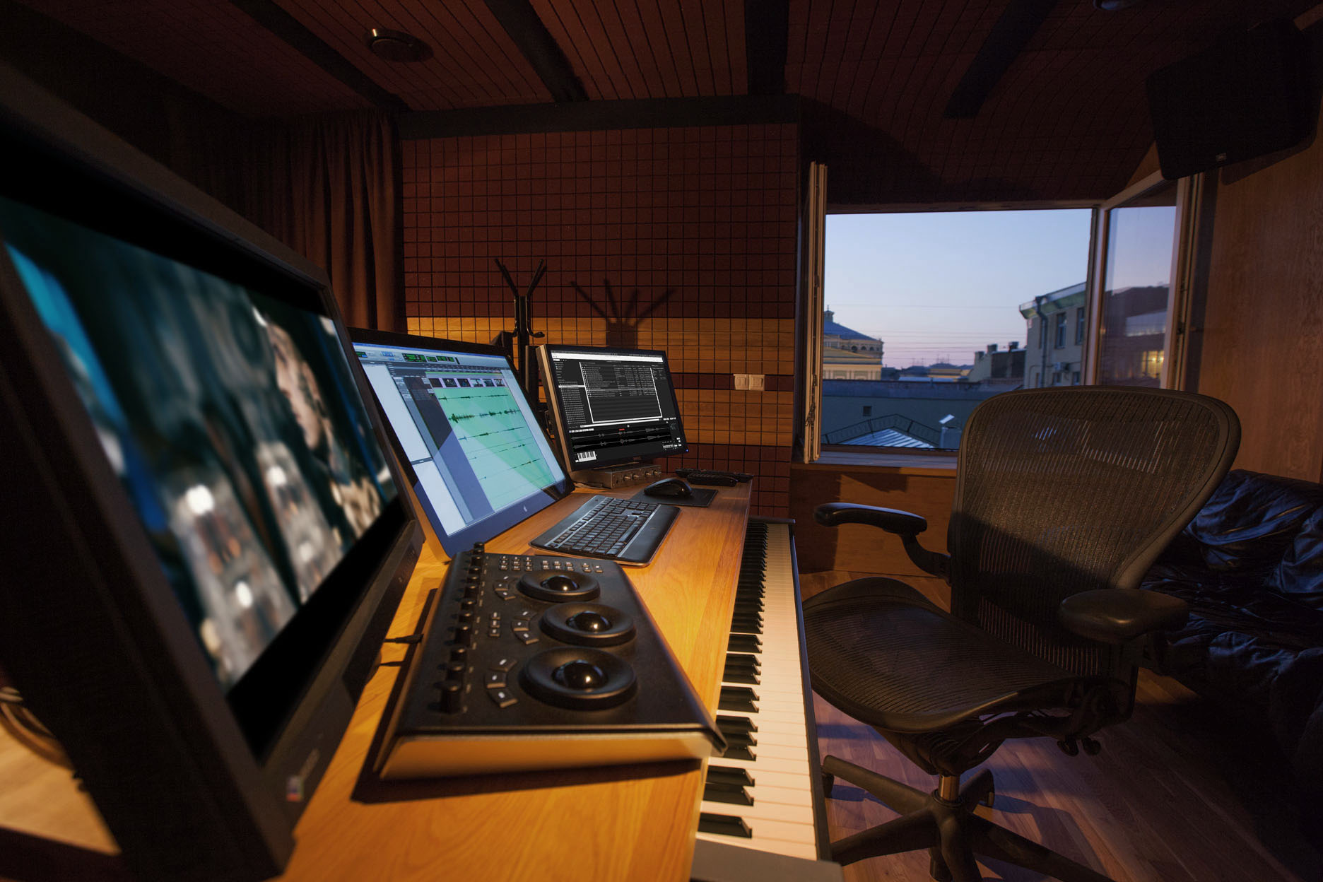 Фронтальные мониторы встроены в стену, за акустически-прозрачным экраном, тыловые висят сзади на кронштейнах. Сводили 5.1 звук и музыку для кино.