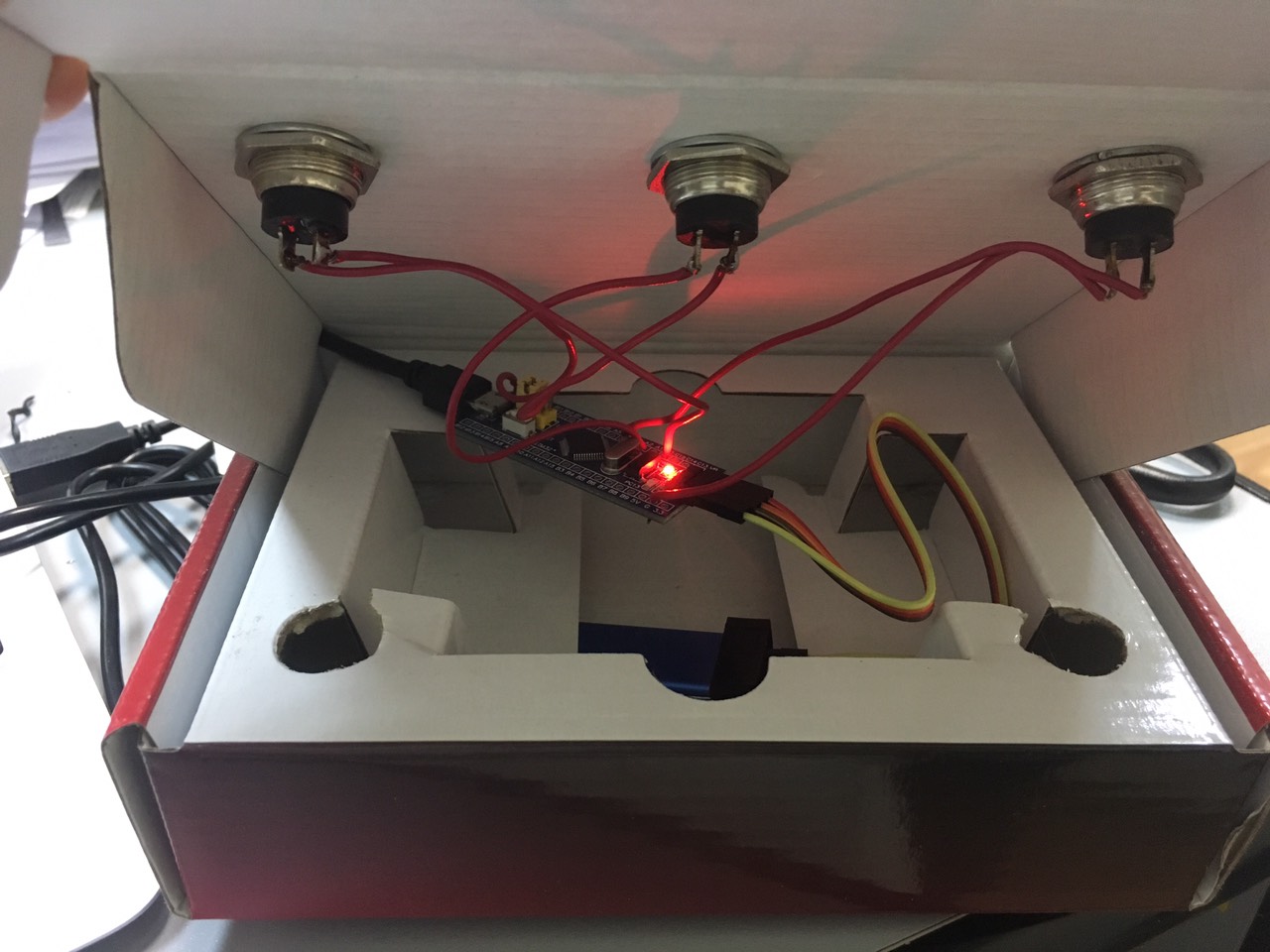 В коробку я запихнул 3 кнопки, повесил их на до, ре и ми и начал пробовать, что получилось... Получилось не очень... Когда я тыкал в плату проводом, запустив пианинку - было гораздо веселее. А тут кнопки показали всю свою сущность, отвратительно замыкаясь... К тому же под рукой абсолютно случайно не нашлось ни конденсаторов, ни резисторов для аппаратного устранения дребезга кнопок, поэтому с ним боролся программным путем, заодно включив подтягивающие резисторы внутри STM-ки. В общем, прикладываю видео, как кнопки работают с Overloud TH-U и фотку внутренностей коробки.