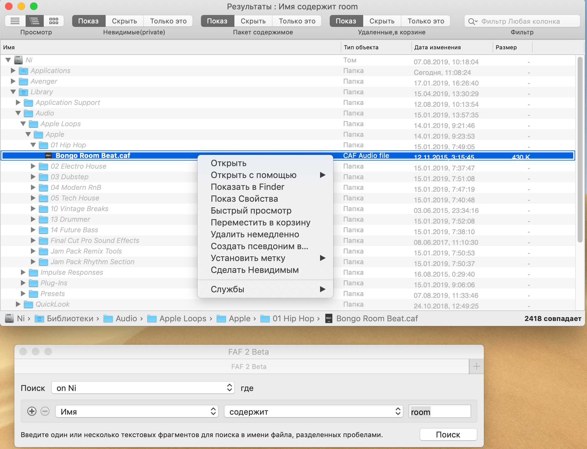 Давно пользуюсь программой Find Any File , позволяет искать файлы на дисках, скрытые, с метками и т.д. Удобно найти удалить файловые остатки в сравнении с спотлайт. Маленькая программка советую.
