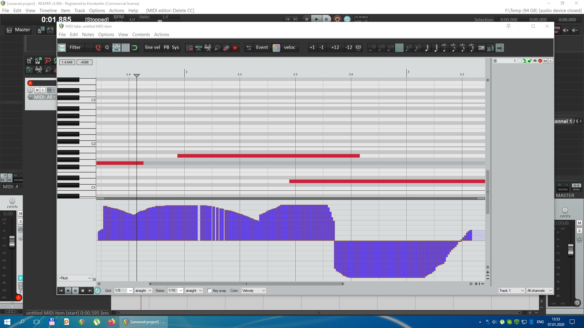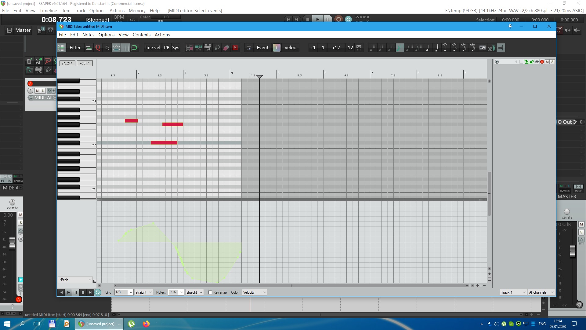 Обнаружил баг, то ли риперовский, то ли системный. При записи с автоквантайзом некоторые звуки зависают и при применении к айтему glue это наглядно видно. Причём после отмены glue, проблема исчезает. Исправляет ситуацию любая манипуляция, изменение велосити, удаление aftertouch и пр. С отключенным автоквантазом всё нормально. Это только у меня?