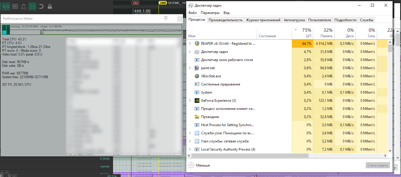 Почему в Perfomance Meter, пиковая нагрузка Total CPU в самых тяжелых сценах достигает 70% при просмотре материала в FullHD, а диспетчер задач показывает загрузку REAPER на 20-25% больше. RT CPU при этом в районе 4-6%. Video Load почему то 0%, хотя диспетчер показывает, что видеоядро загружено на 20%
