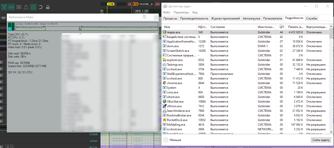 Но если нажать на процесс Reaper > подробно, то в детальном виде диспетчера задач загрузка reaper совпадает со значениями в Perfomance Meter.
