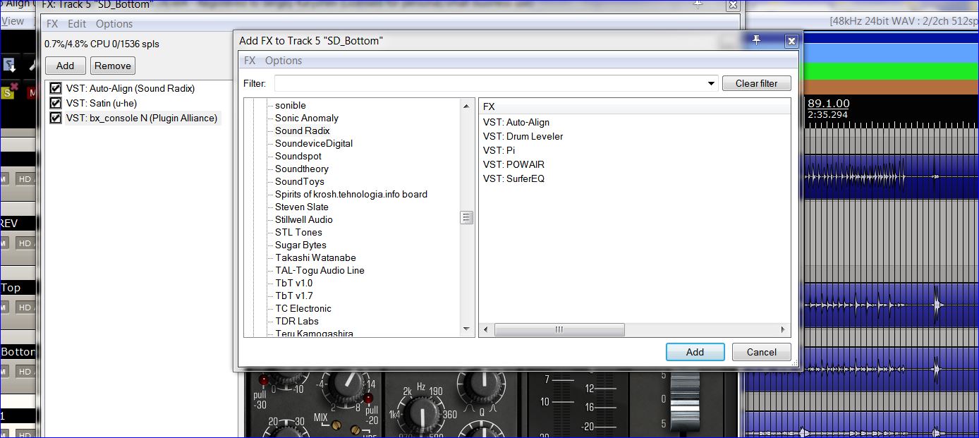 Пробовал: VST:Auto-Align, VST: Auto-Align, VST: Auto-Align (Sound Radix) - не работает, причем независимо от того, в каком слоте расположен плагин. В случае же SurferEQ сработала строка VST: SurferEQ. Можно, конечно, пользоваться вот этим: SWS/S&M: Toggle FX 1 bypass for selected tracks, все равно этот плагин должен стоять в первом слоте. Но все же интересна причина такого поведения. Спасибо всем откликнувшимся, хоть и тема :::::: не раскрыта)