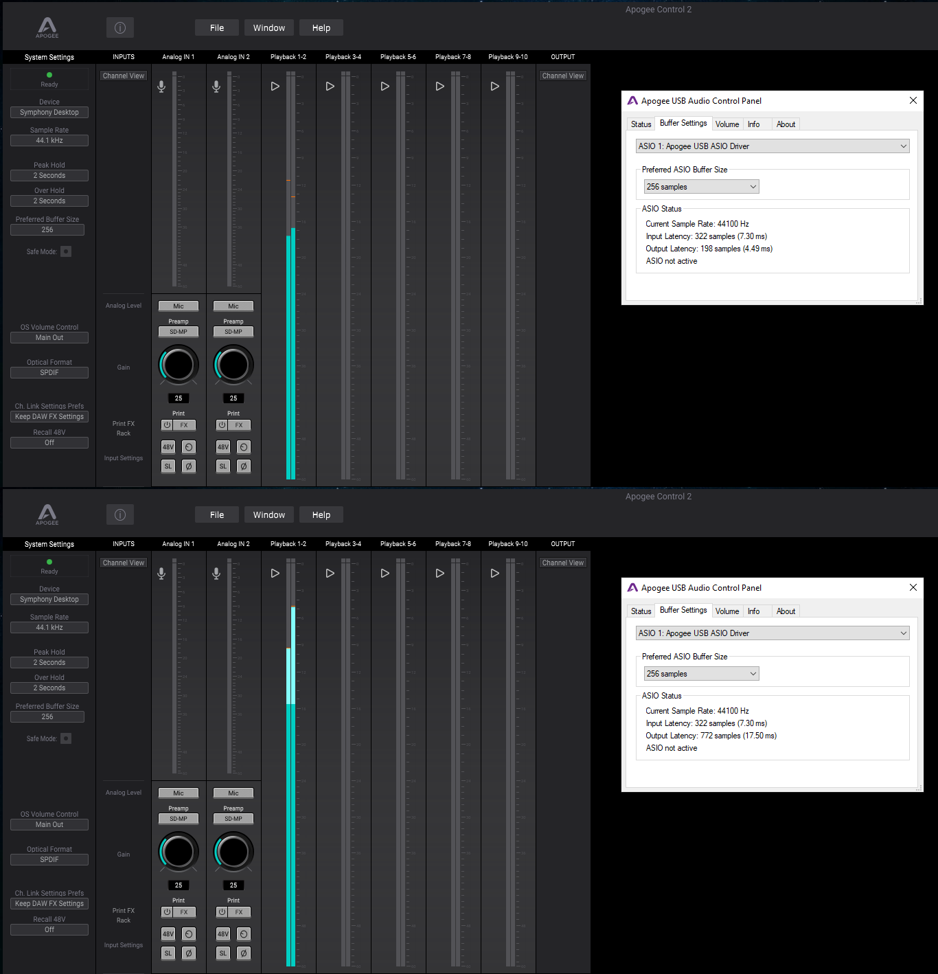 Словил я баг с буффером.. Реально после выключения и включения интерфейса слетает значение output latency до 17.5 ms. При этом неважно какое значение буффера было выбрано до перезагрузки интерфейса, при любом выбранном значении после перезагрузки именно интерфейса, значение слетает на 17.5 ms... Однако если саму карту не выключать, то перезагрузка компьютера не приводит к этому багу...