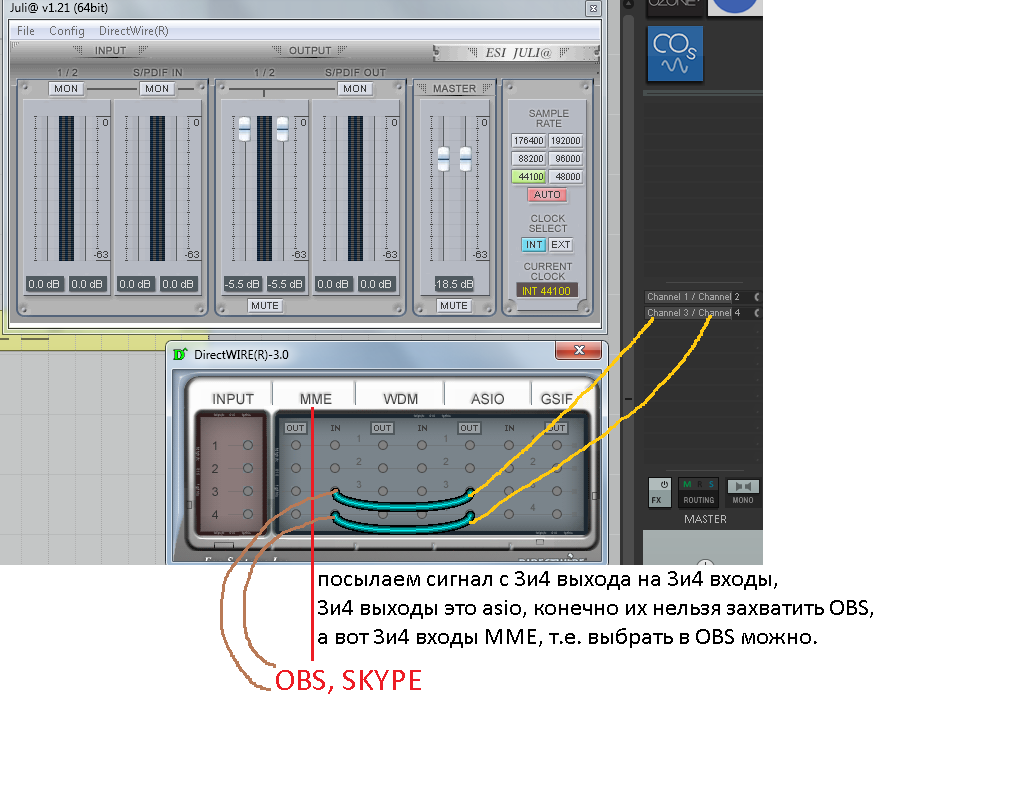 Нужно выбрать 1 стереопару(например 1и2) выходов в микшере windows и сделать захват этих каналов в OBS(это будут системные звуки, браузеры и т.д - WDM). OBS asio не захватывает, для этого мы добавляем помимо основной стереопары выходов (1и2 для мониторинга) в DAW ещё незадействованную (например 3и4). И через directwire соединяем 3и4 выходы с 3и4 входами(это чтобы раздельно были звуки системы и daw), добавляем источник звука в OBS там выбираем 3и4 входы.
