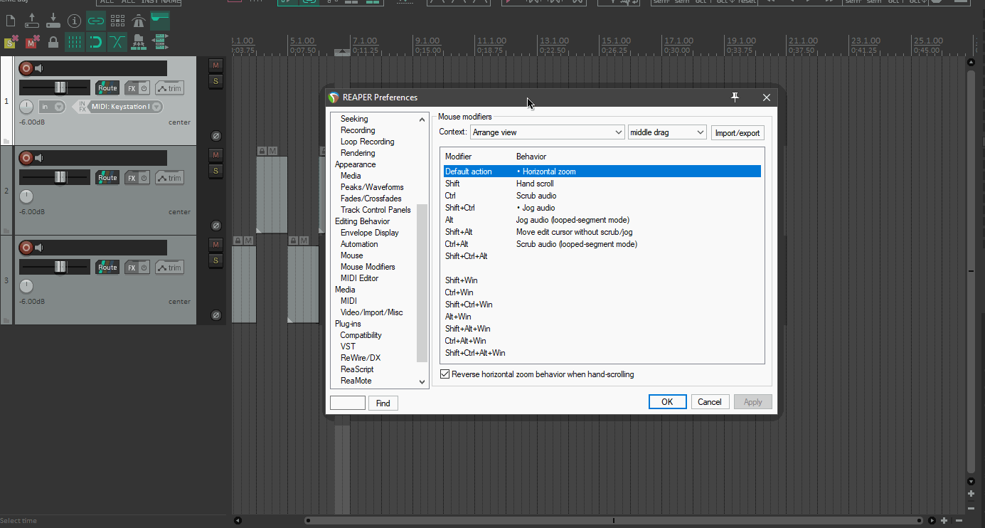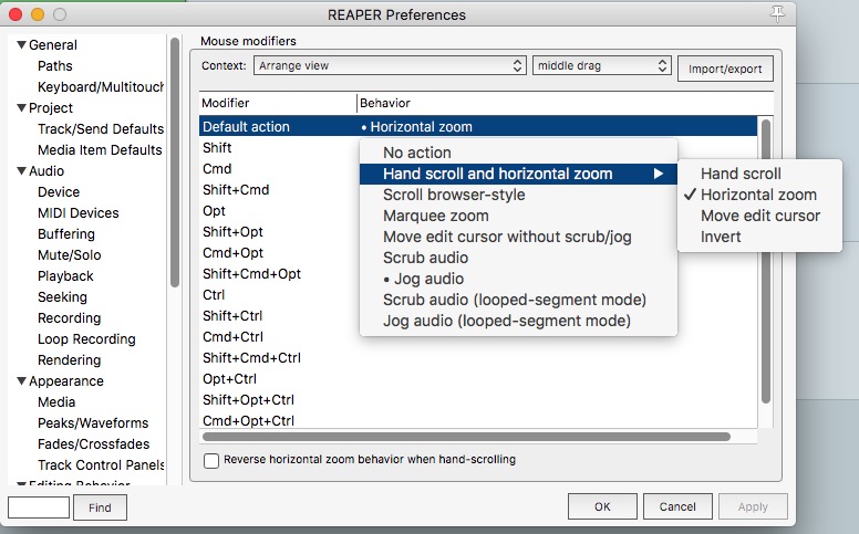 Добрый день! Скорее всего многие из вас пользовались разными DAW и фрутиком в том числе! Не знаю как вам, но лично мне очень понравилось как в фруктах реализована прокрутка (hand scroll) по плей листу! Возможно ли в рипере так же настроить! А именно настроить hand scroll так чтоб если трек двигаешь в право и прокрутка шла в право, и наоборот! если в верх то горизонтальный зум, вниз наоборот! У меня не получилось найти ответ! Может у вас есть какие-нибудь соображения по этому поводу?