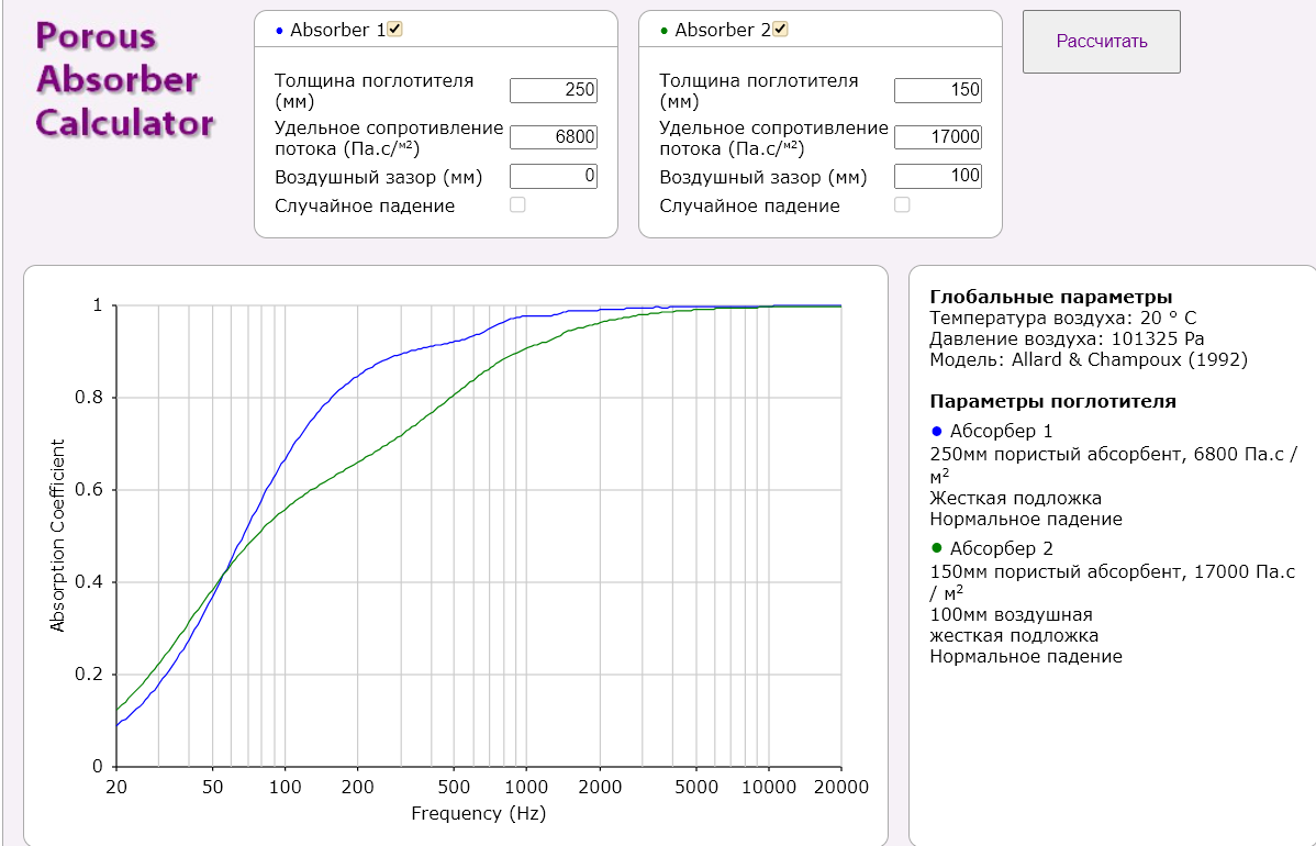 Синий график, материал холлофайбер Акустик 2500 ( 25/кг м3), зеленый график, холлофайбер хард 2500 ( 50/кг м3.)