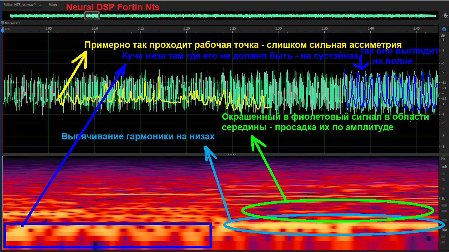 Вот еще разница, которую я заметил, но не знаю из-за чего это может происходить: Fortin Nts, да и Randall Thrasher тоже реагируют на разогретый, суть насыщенный верхами диайник так, что происходит более сильная поляризация рабочей точки, т.е. её чрезмерно сильное смещение в одну из частей волноформы, сказал бы, что в негативную, но если сигнал с усилителя инвертирован, то наоборот. Как бы там ни было это дает более жесткий по звучанию тэмбр и всего-лишь одна гармоника на басах в районе от 100 до 150Гц становится преобладающей, середина проседает и усилитель "мычит".