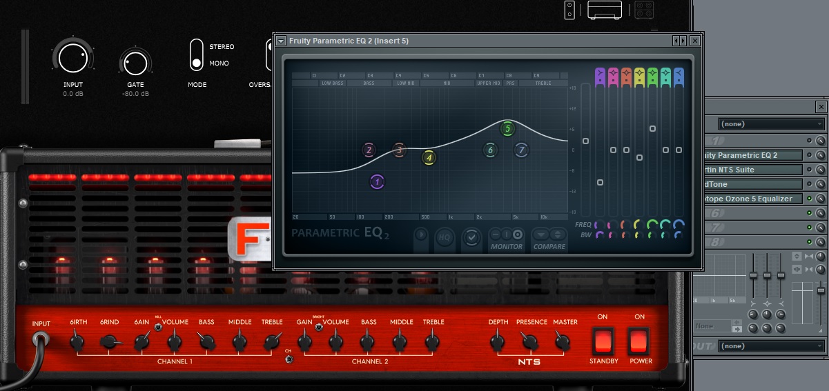 У плагина Fortin Nts были отключены кабинет симуляция и педали, установлен режим оверсэмплинга на выское качество при сэмплрэйте в DAW 44100Hz. Добавил перед ним еще и эквалайзер, чтобы поднять верха и середину до него, чтобы звучало по плотности как Fortin Natas.