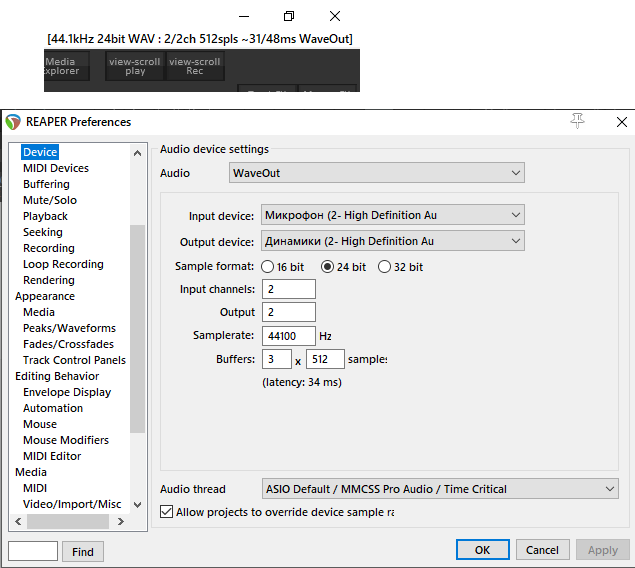 Реальная задержка = 764smpls = 17,3ms (Если ПК мощный, то и с таким буфером работает стабильно)