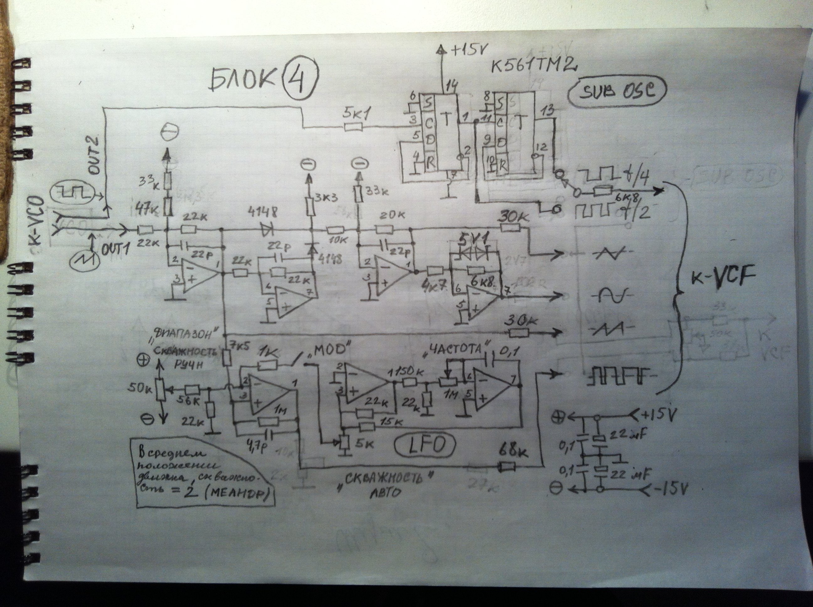 , каждый в виде отдельного блочка, соединены между собой, что говорится, "на соплях". Ну, для испытаний и демонстрации, думаю, будет достаточно. Да, при испытании много нюансов вскрылось, над которыми поработать нужно, и учесть в дальнейшем. Хочу попробовать еще "хорус". Для этого нужно повторить генератор и волнопреобразователь. Ну, волнопреобрасователь можно по урезанной схеме - без ШИМ, да и сигналы оставить - "SUB OSC", ну и "треугольник" с "пилой", например, что б запускать второй генератор в унисон главному, для обогащения, так сказать, звука. А на "хорус" берутся сигналы "SUB OSC" и через смеситель на сам блок "хорус". Если что - все схемы у меня есть, могу поделиться. Чуть позже эту штуку соберу, платы уже готовы. На мой взгляд, может я ошибаюсь, разницы между треугольником и синусом нет, ну не услышал я, практически. А что такое синус - тот же треугольник, только с закругленными вершинами. Так может и не париться с этим синусом, я, например, запарился его выводить на волнопреобразователе, никак не хотел! Хорошо люди подсказали, маленькое изменение в схеме, и то резисторы подгонял, пока нужную форму не получил. В самом "Поливоксе", или "Ритм-2" я "синуса" не наблюдал. Фильтр, как я уже говорил, от "Поливокса", а тот что Коб нарисовал у меня так и не запустился. Когда запустил весь синт, игрался с ним несколько дней, звуков и эффектов, конечно, выдает немеряно. Очень легко, например, синтезировать бас гитару, один раз получил что-то очень похоже на соло гитару с фаз эффектом, правда, сколько не пытался потом повторить - не получается, забыл что крутил и куда. Для "стринг" звучания, чую, нужен унисон. А вообще, если по мне, вещь афигенная, хоть и много работы еще, я об такой и мечтал.