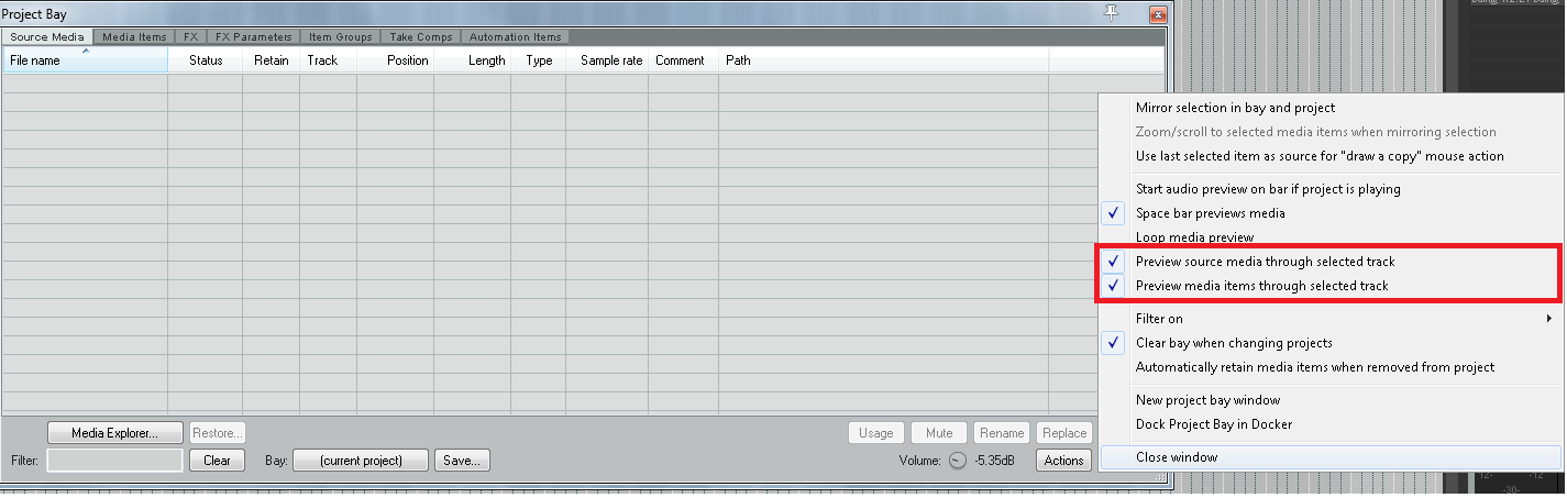 Вас понял, сейчас буду смотреть.Я ведь не могу знать, что у Вас происходит. Если у вас мониторинг идёт не через 1 и2 выходы, то в этом может быть проблема. Т.к. media explorer и project bay по-молчанию выводят звук через 1 и 2 выходы, минуя мастер. Можно сделать так, чтобы они играли через выделенные треки т.е. через любые выходы.