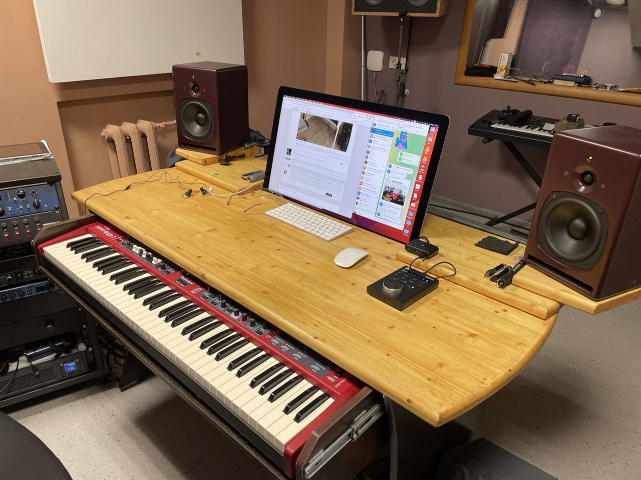 Для продюсерской работы пришел в итоге к сетапу состоящему из обычного небольшого стола (в идеале регулируемому по высоте) и одной/двумя скошенными рековым тумбочкам на колесиках типа такой.