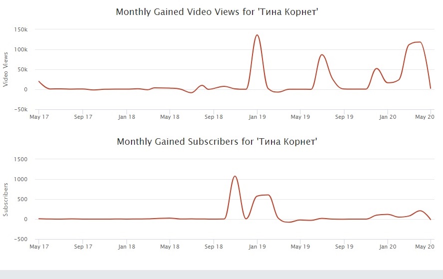 Вы начинаете проверять такого специалиста по услугам, ну раз он делает хитовые песни под ключ, значит, они должны иметь отклик у слушателя? Заходим на Ютуб-канал Тины Корнет, видим хорошую просматриваемость и никакую активность на канале - лайки, комментарии, подписки, всё это никакое на фоне количества прослушиваний. Возникают первые мысли, что это накрутка. Просим более опытного в этом вопросе разобраться, и он выдаёт график, который поймёт любой.