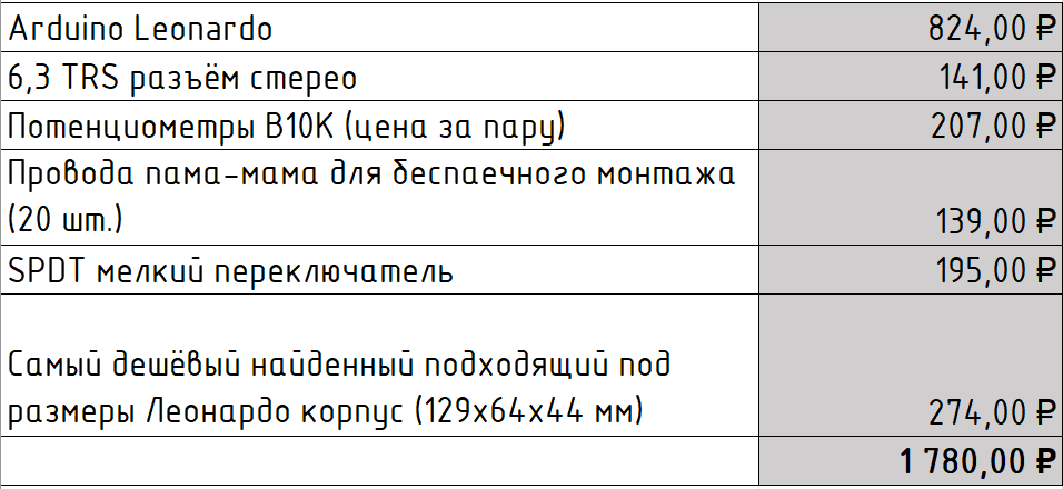 - Arduino (DUE, micro, я предпочел Leonardo - 600руб) [UNO не подойдет поскольку не поддерживает библиотеку MIDI]