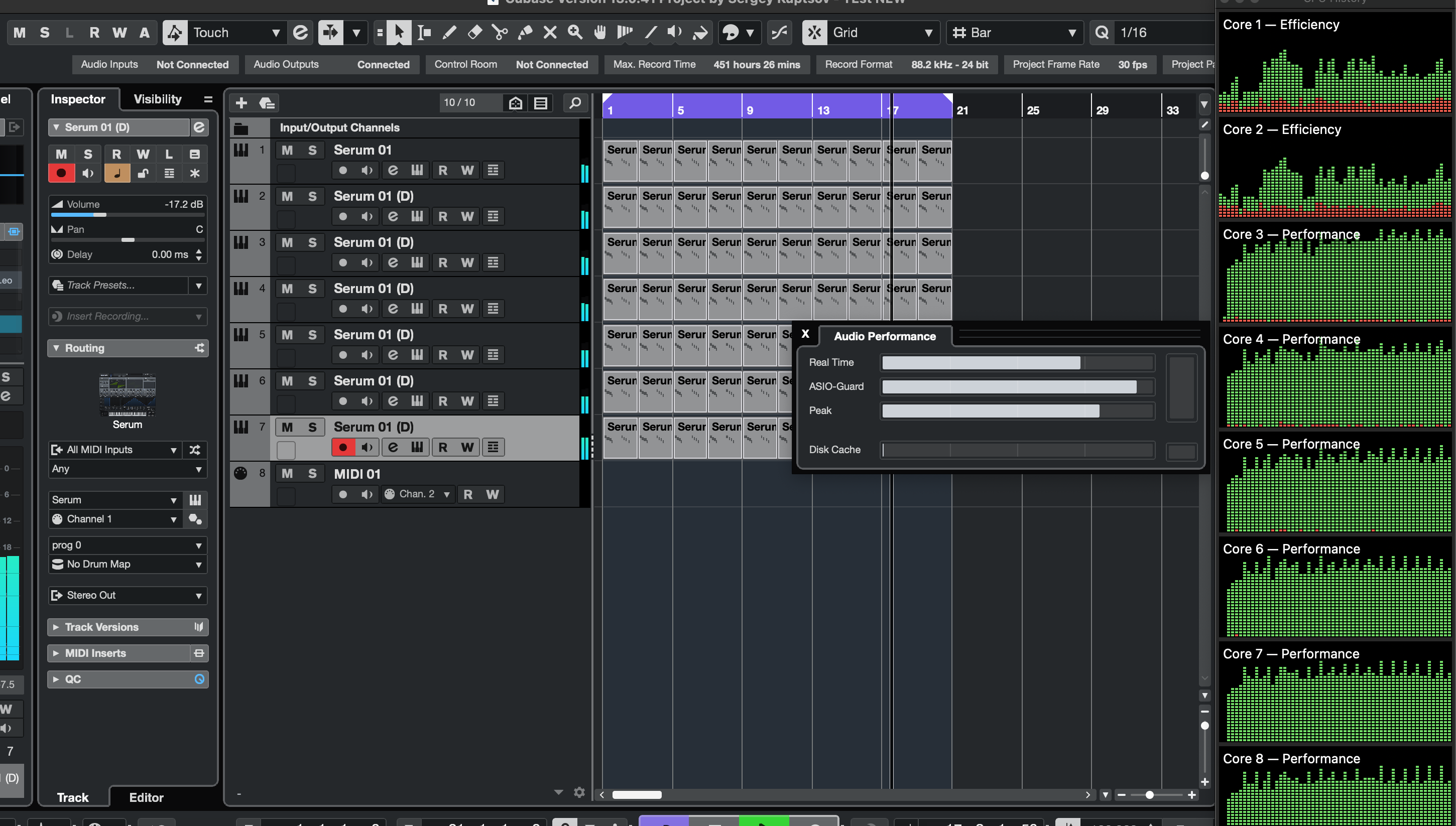 Сравнивалось само собой в кьюбейсе, был создан проект в 88.2 кгц, в нём трек с серумом, в инсерт которого повесили ssl ev2 и soothe2 с максимальным разрешением и оверсемплингом. Далее треки копировались до треска при воспроизведении. m1 ultra смог озвучить 40 таких треков, а мой 5960х ни одного. Такие вот дела.. Поэтому я к новому мак мини на м4 про теперь могу обратиться не иначе как "Ваше превосходительство"