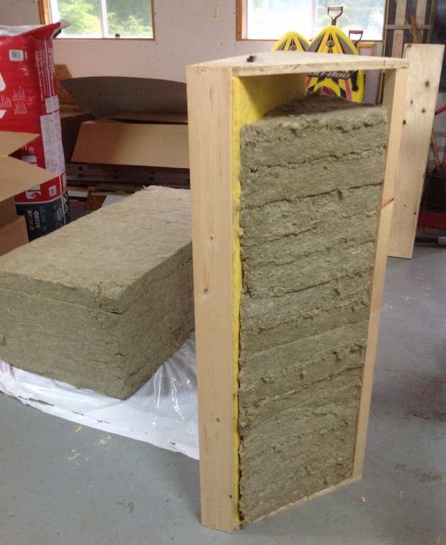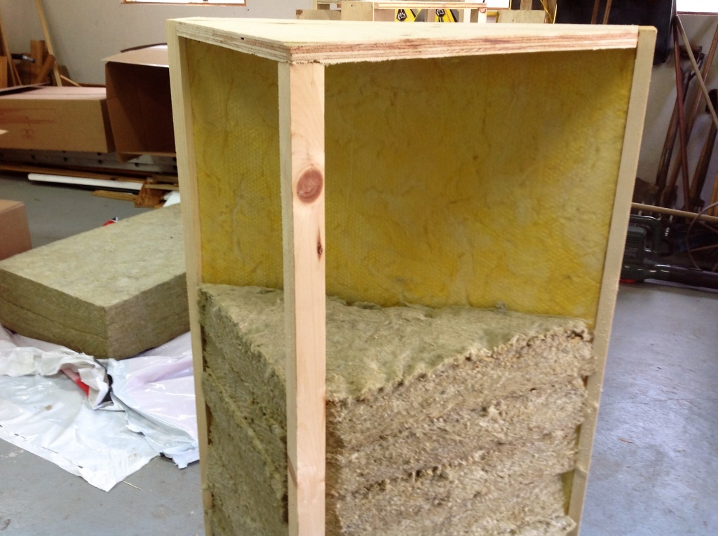 Можно делать и по другому. Передняя жесткая панель- 45-60 кг/ м3, в качестве своеобразной мембраны, за ней в угол закладываем стекловолокно или холлофайбер с плотность 10-15 кг/м3.@Xmental, Самое действенное вообще, что мне приходилось видеть, так это просто выделить свободный угол комнаты, и полностью забить его поглотителем. Где-то по метру от углу. Сожрёт пространства конечно, но работать будет точно.