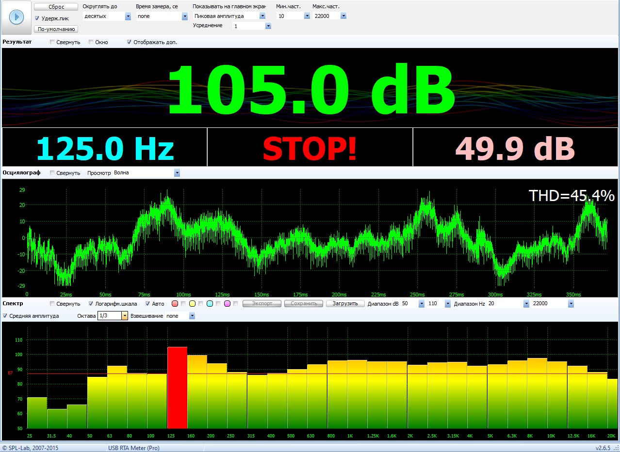 RTA Meter Pro был установлен на высоте ушей в месте прослушивания и на уровне между большими диффузорами акустики и пищалками (средняя точка). Замер проводился по принципу равнобедренного треугольника (как обычно рекомендуют производить установку производители мониторной аккустики).