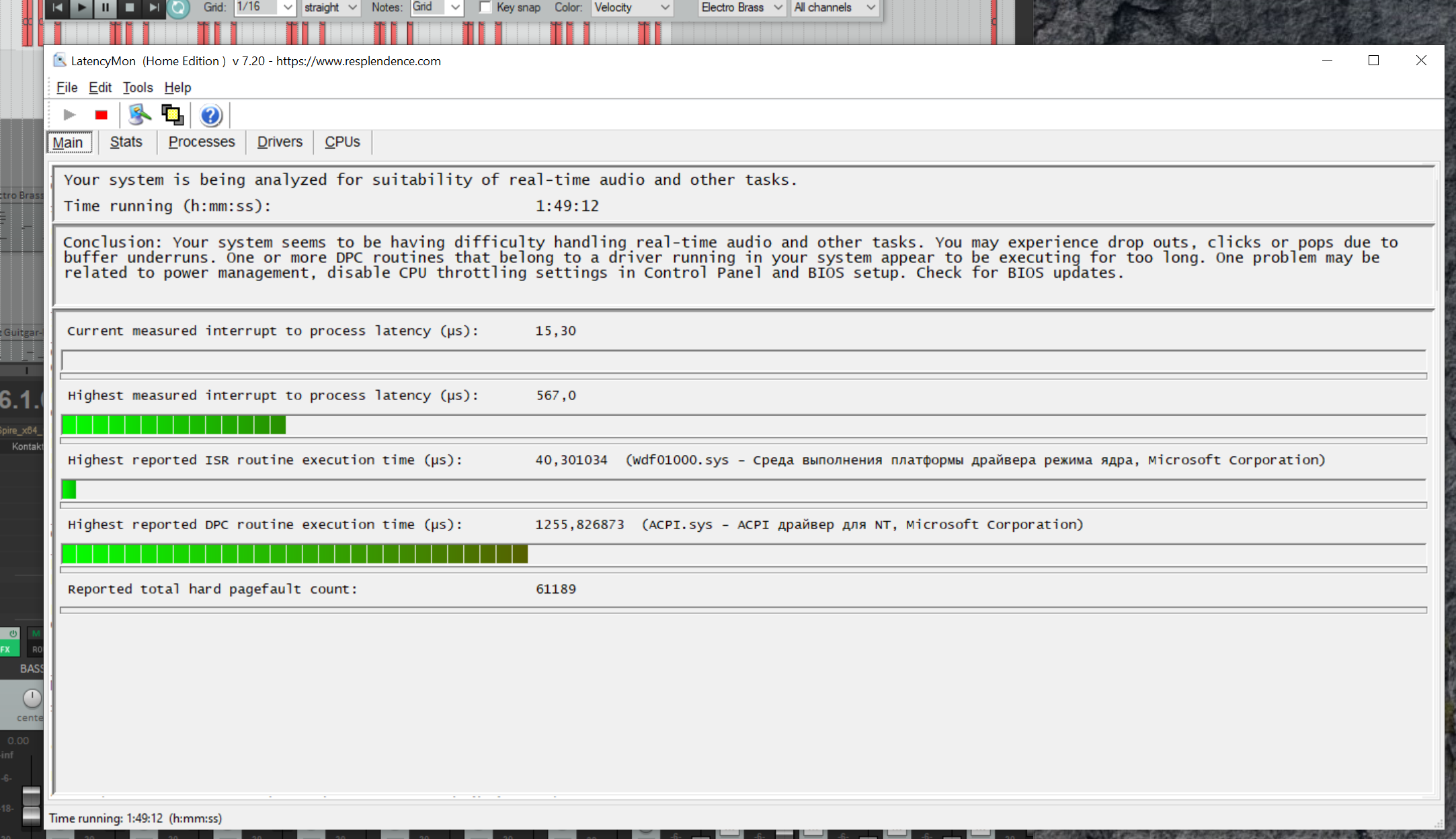 Я начал работать с включенным ЛатенсиМон и забыл про него. Проработал 1 час 49 минут, параллельно заходил на YouTube поглядывая на современные хиты. Статистика, конечно, сильно расширилась и, насколько я понимаю, погруснела...