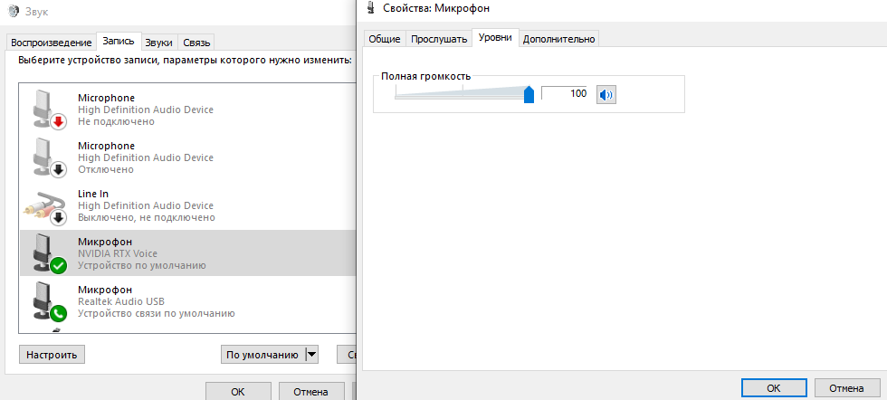 Так же стоит отметить, что решил воспользоваться RTX Voice, чтобы не записывать посторонние шумы вокруг микрофона. По мимо всего этого, у брата тот же микрофон, та же программа для подавления шума, и также в уровнях ползунок стоит на 100. Вот уровни в RTX Voice. При этом у него речь записывается громче чем у меня.