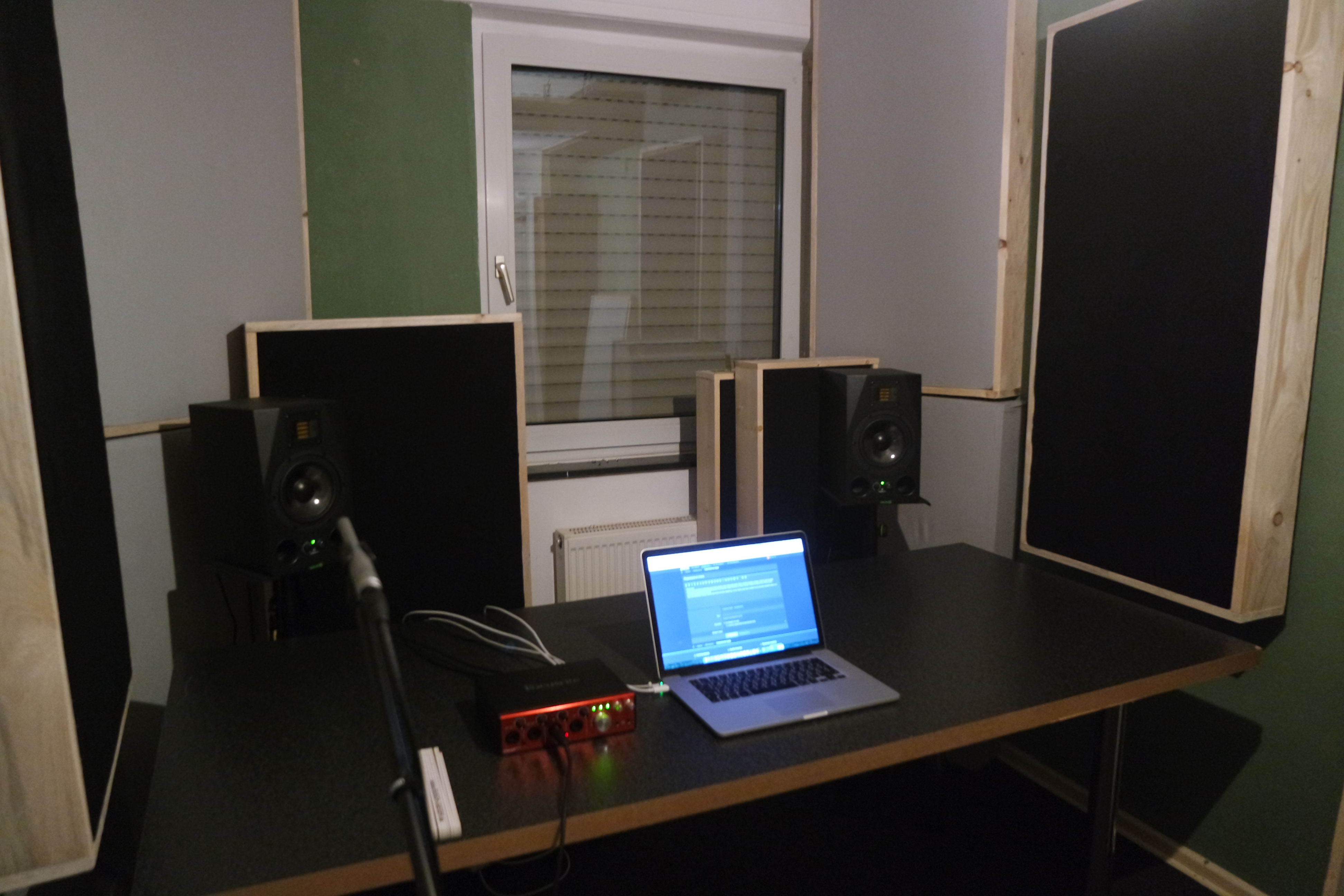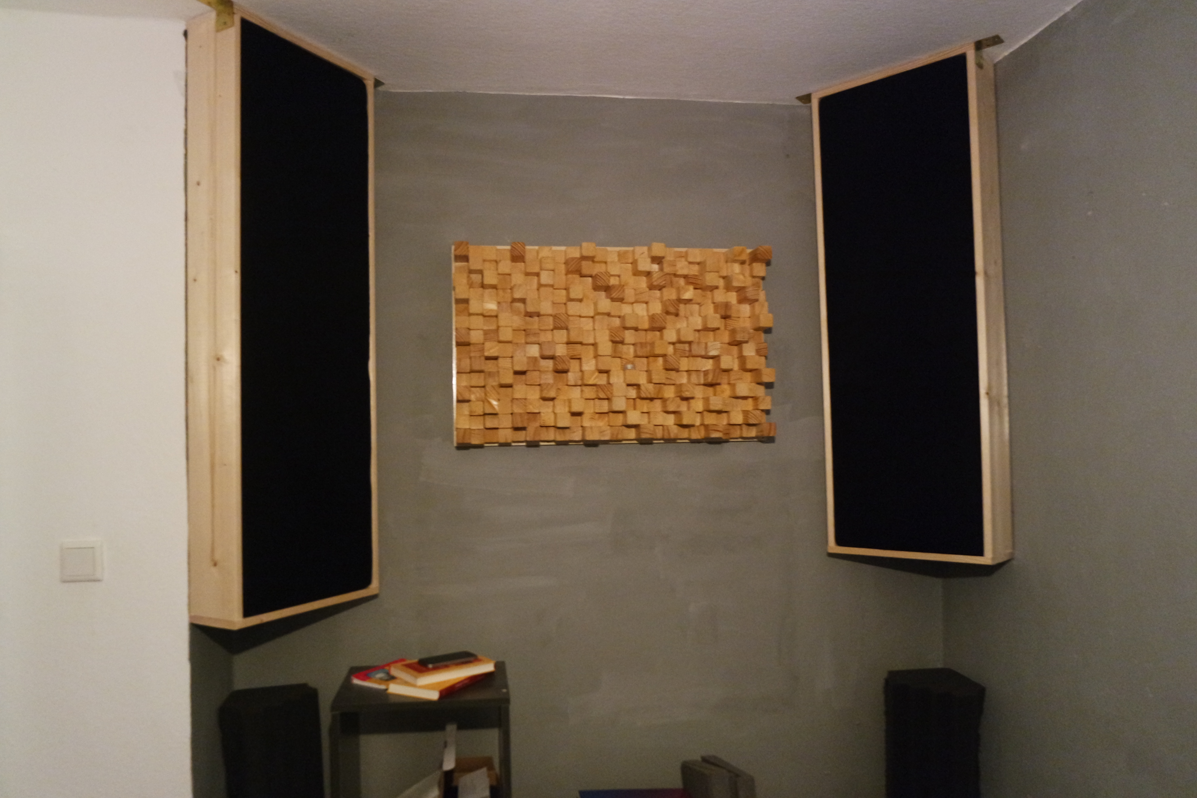 Но если другое помещение вам не светит, доведите до ума хотя бы существующее. Устраните тыловые отражения от стекла за мониторами, хотя бы тяжелыми шторами. Углы (стыки поверхностей) не перекрыты бас-трэпами. От поглотителей на фото 7966 особого проку не будет. Кроме этого, я не уверен, что абсорберы по бокам перекрывают зону ER. Можно узнать, какими соображениями вы руководствовались при их установке?