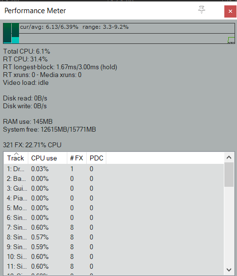 До треска всего 7 дорожек (56 плагинов). RT CPU 90%, а Total CPU всего 10%.